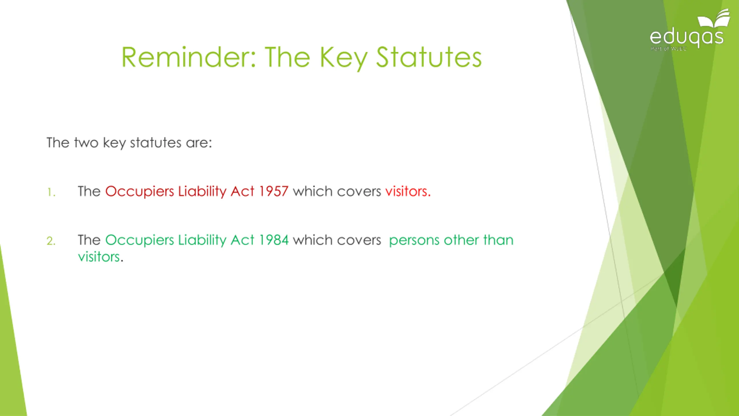 Reminder: The Key Statutes The two key statutes are: The Occupiers Liability Act 1957 which covers visitors. 1. The Occupiers Liability Act 1984 which covers persons other than visitors. 2.