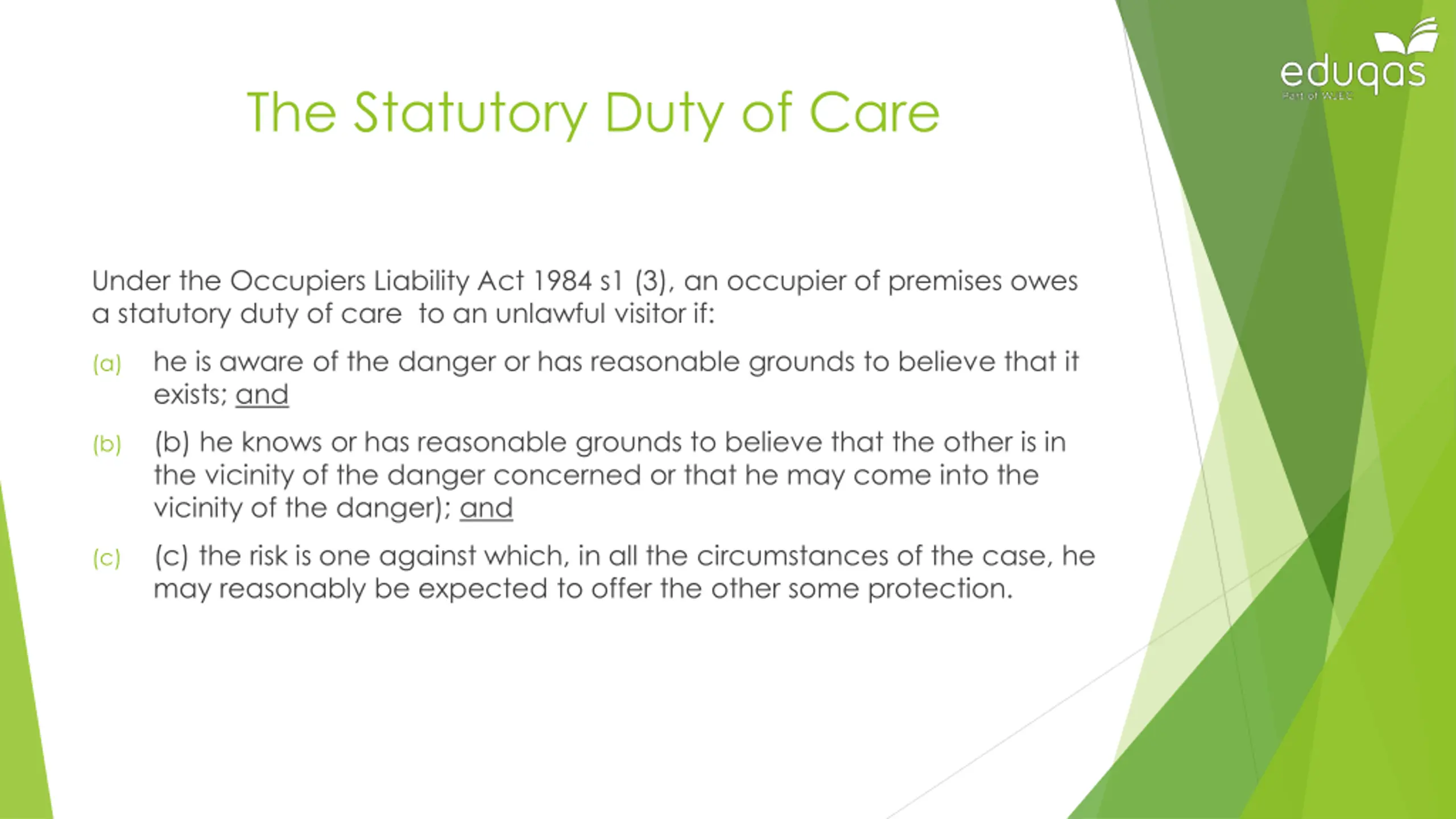 The Statutory Duty of Care Under the Occupiers Liability Act 1984 s1 (3), an occupier of premises owes a statutory duty of care to an unlawful visitor if: he is aware of the danger or has reasonable grounds to believe that it exists; and (a) (b) he knows or has reasonable grounds to believe that the other is in the vicinity of the danger concerned or that he may come into the vicinity of the danger); and (b) (c) the risk is one against which, in all the circumstances of the case, he may reasonably be expected to offer the other some protection. (c)