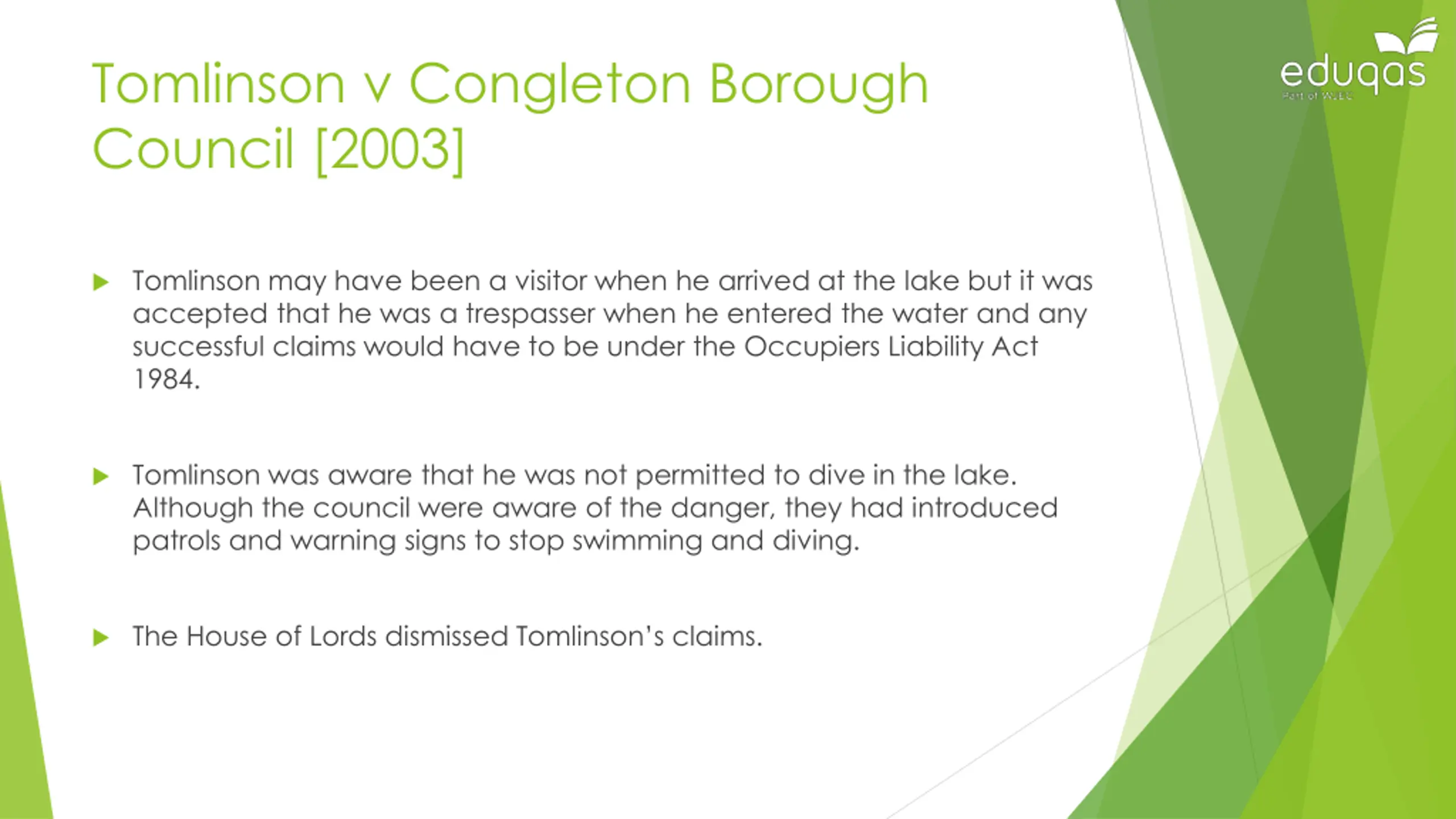 Tomlinson v Congleton Borough Council [2003] Tomlinson may have been a visitor when he arrived at the lake but it was accepted that he was a trespasser when he entered the water and any successful claims would have to be under the Occupiers Liability Act 1984. Tomlinson was aware that he was not permitted to dive in the lake. Although the council were aware of the danger, they had introduced patrols and warning signs to stop swimming and diving. The House of Lords dismissed Tomlinson s claims.