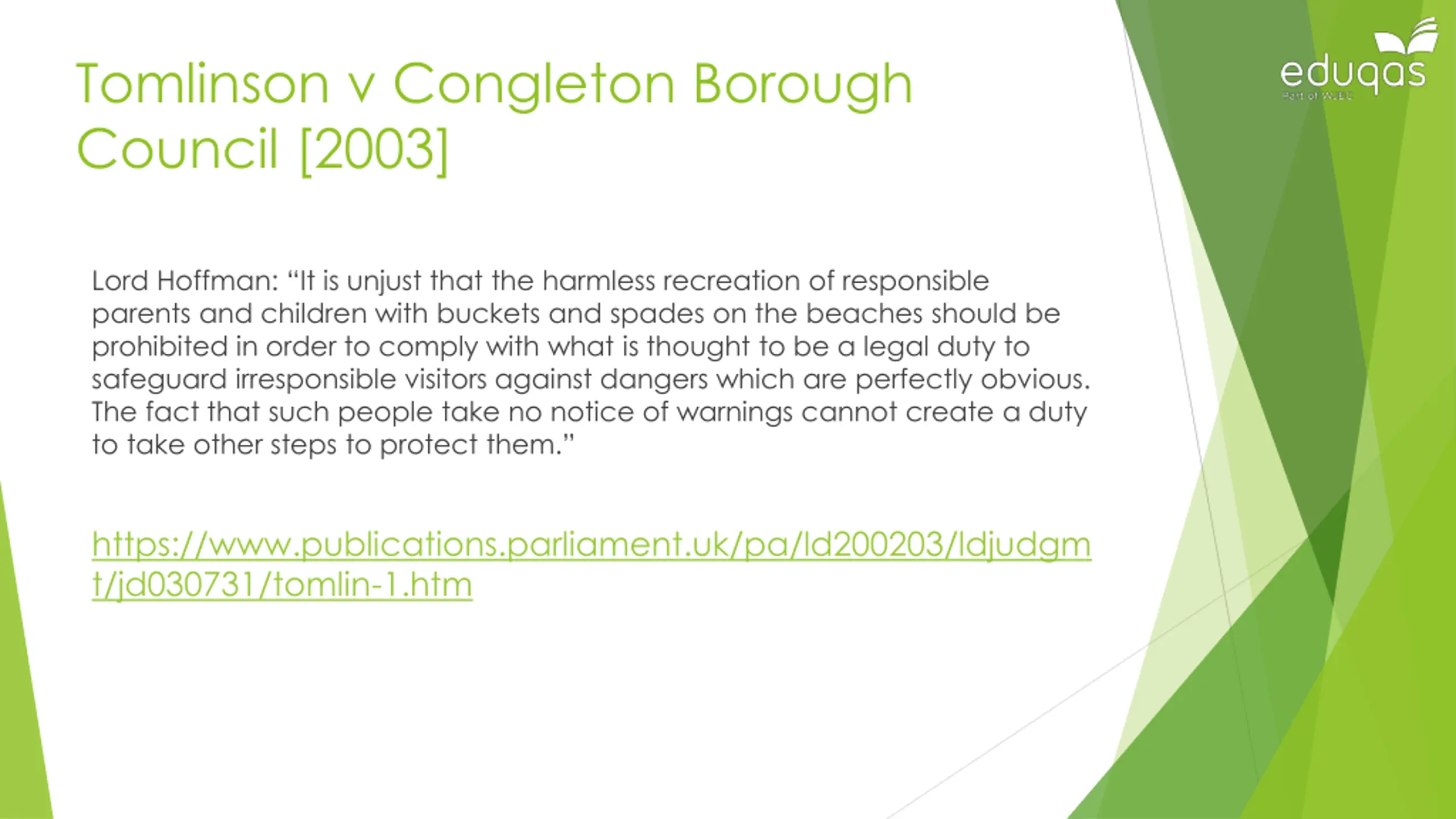 Tomlinson v Congleton Borough Council [2003] Lord Hoffman: It is unjust that the harmless recreation of responsible parents and children with buckets and spades on the beaches should be prohibited in order to comply with what is thought to be a legal duty to safeguard irresponsible visitors against dangers which are perfectly obvious. The fact that such people take no notice of warnings cannot create a duty to take other steps to protect them. https://www.publications.parliament.uk/pa/ld200203/ldjudgm t/jd030731/tomlin-1.htm
