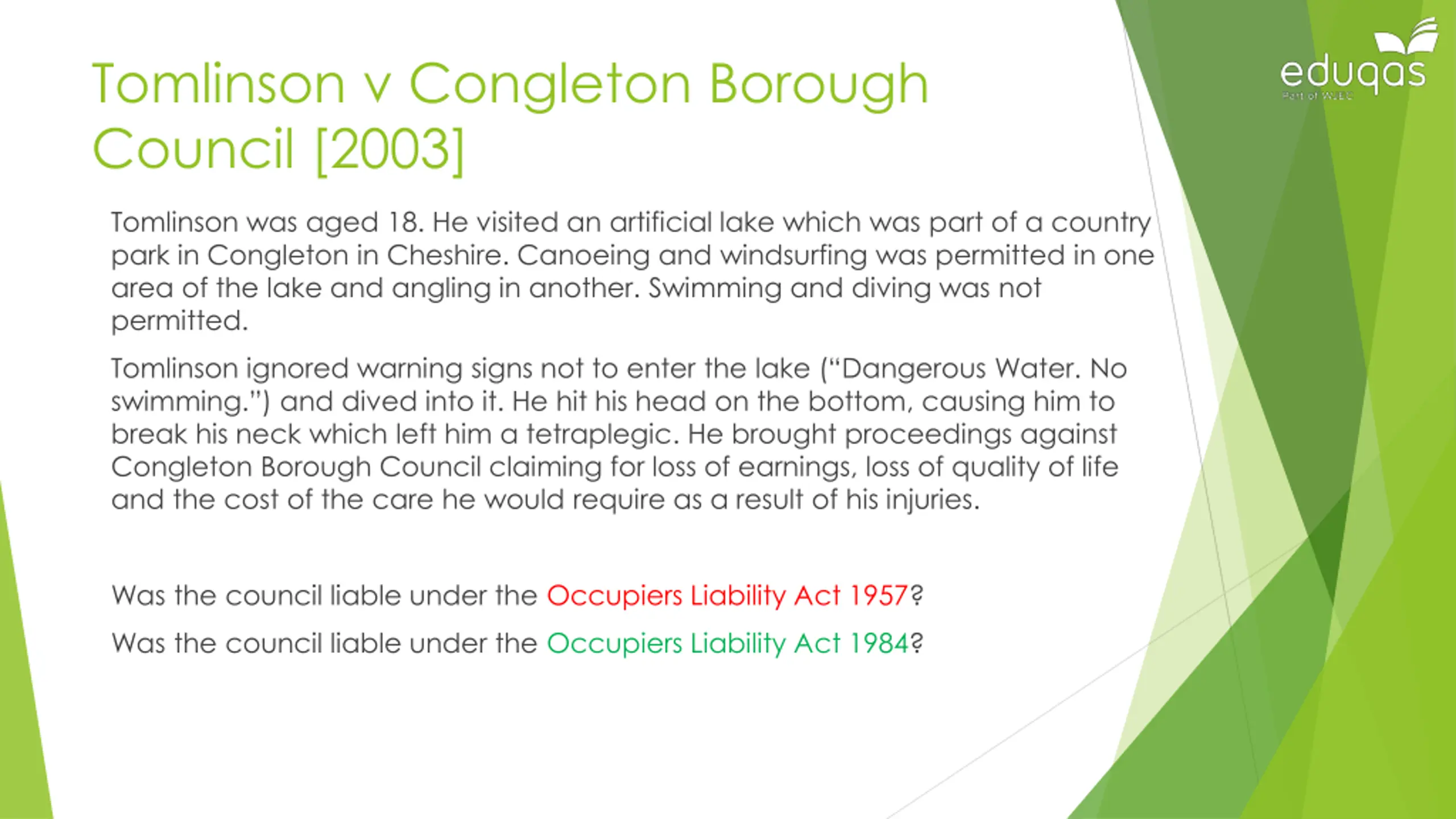 Tomlinson v Congleton Borough Council [2003] Tomlinson was aged 18. He visited an artificial lake which was part of a country park in Congleton in Cheshire. Canoeing and windsurfing was permitted in one area of the lake and angling in another. Swimming and diving was not permitted. Tomlinson ignored warning signs not to enter the lake ( Dangerous Water. No swimming. ) and dived into it. He hit his head on the bottom, causing him to break his neck which left him a tetraplegic. He brought proceedings against Congleton Borough Council claiming for loss of earnings, loss of quality of life and the cost of the care he would require as a result of his injuries. Was the council liable under the Occupiers Liability Act 1957? Was the council liable under the Occupiers Liability Act 1984?