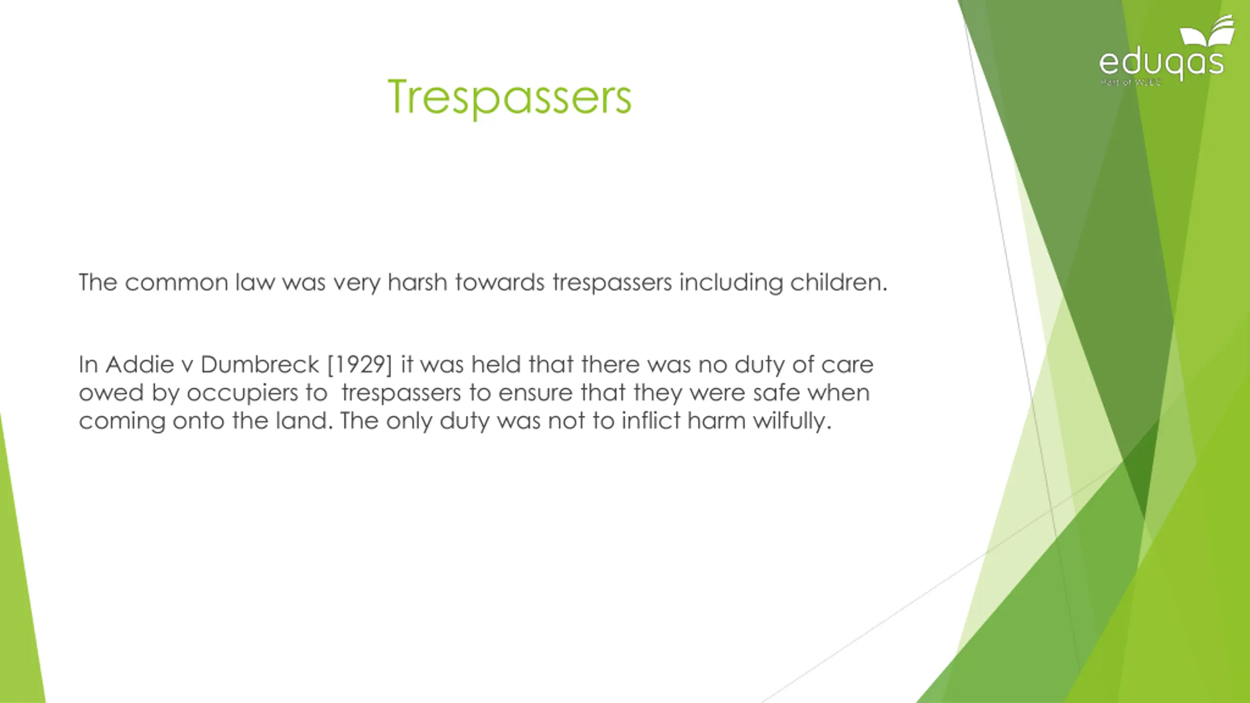 Trespassers The common law was very harsh towards trespassers including children. In Addie v Dumbreck [1929] it was held that there was no duty of care owed by occupiers to trespassers to ensure that they were safe when coming onto the land. The only duty was not to inflict harm wilfully.