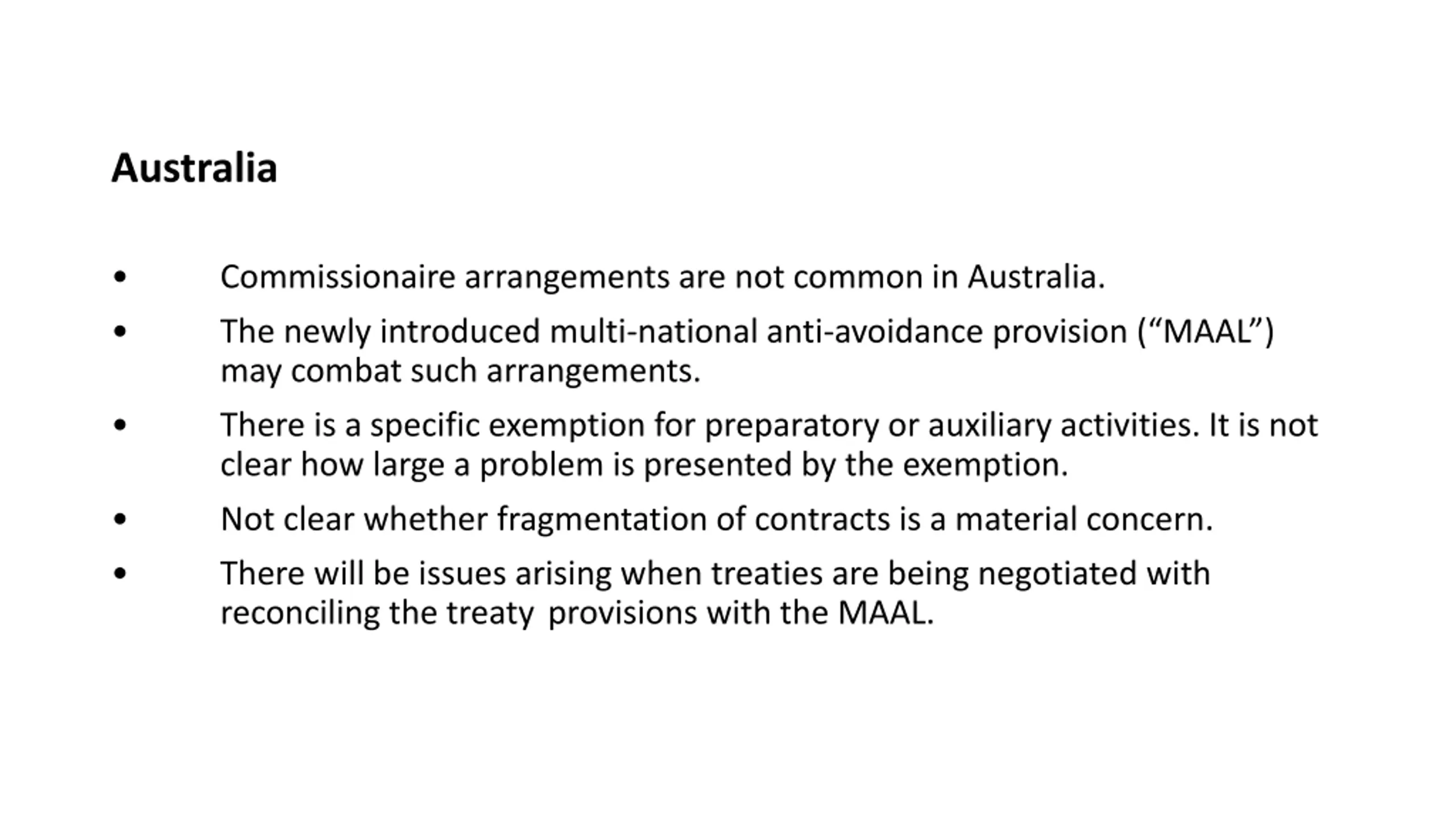 Australia Commissionaire arrangements are not common in Australia. The newly introduced multi-national anti-avoidance provision ( MAAL ) may combat such arrangements. There is a specific exemption for preparatory or auxiliary activities. It is not clear how large a problem is presented by the exemption. Not clear whether fragmentation of contracts is a material concern. There will be issues arising when treaties are being negotiated with reconciling the treaty provisions with the MAAL.
