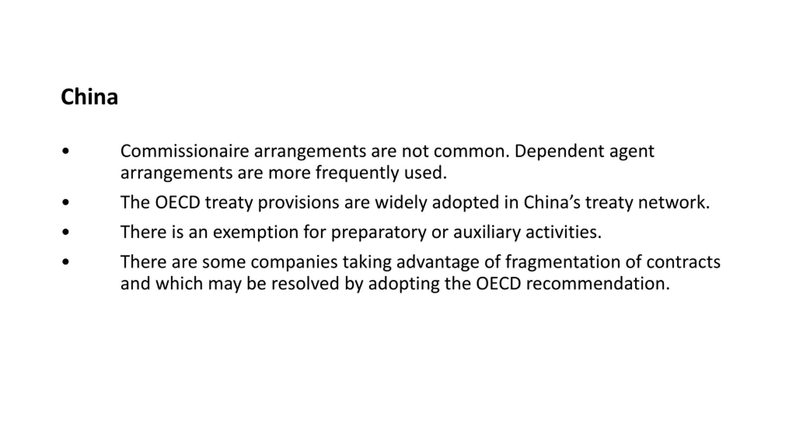 China Commissionaire arrangements are not common. Dependent agent arrangements are more frequently used. The OECD treaty provisions are widely adopted in China s treaty network. There is an exemption for preparatory or auxiliary activities. There are some companies taking advantage of fragmentation of contracts and which may be resolved by adopting the OECD recommendation.