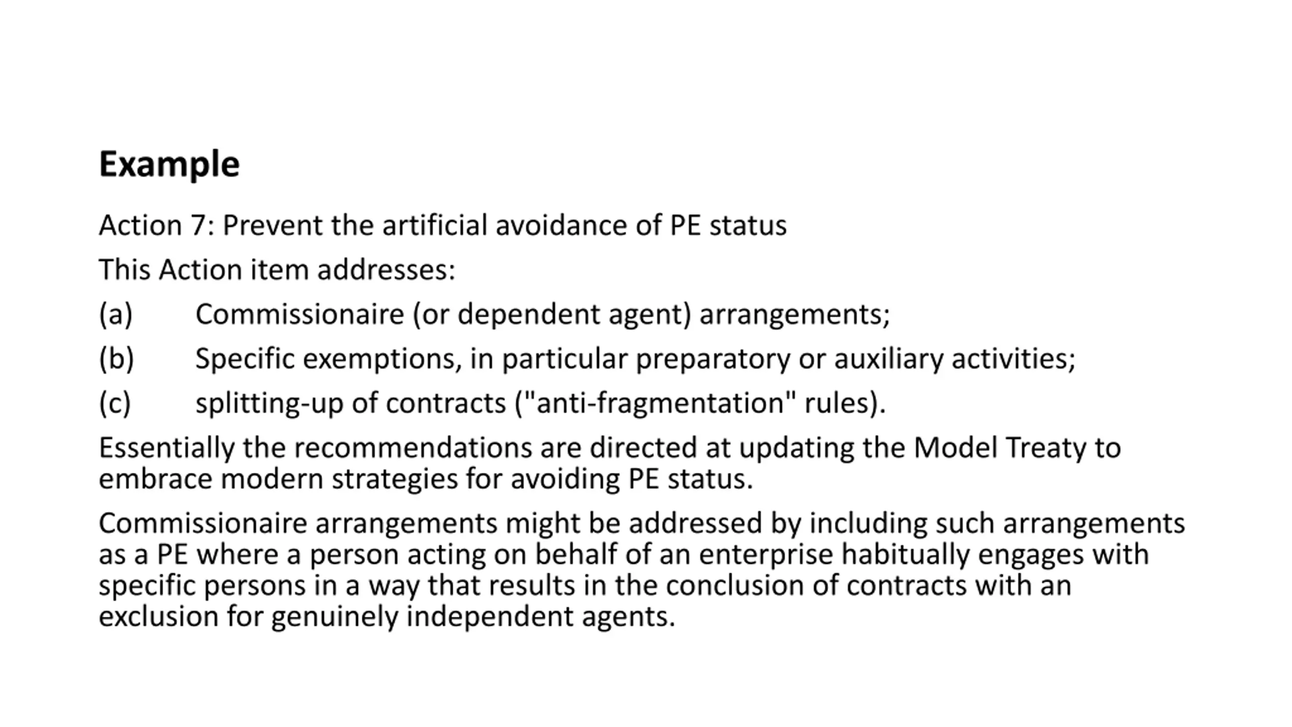 Example Action 7: Prevent the artificial avoidance of PE status This Action item addresses: (a) Commissionaire (or dependent agent) arrangements; (b) Specific exemptions, in particular preparatory or auxiliary activities; (c) splitting-up of contracts ("anti-fragmentation" rules). Essentially the recommendations are directed at updating the Model Treaty to embrace modern strategies for avoiding PE status. Commissionaire arrangements might be addressed by including such arrangements as a PE where a person acting on behalf of an enterprise habitually engages with specific persons in a way that results in the conclusion of contracts with an exclusion for genuinely independent agents.