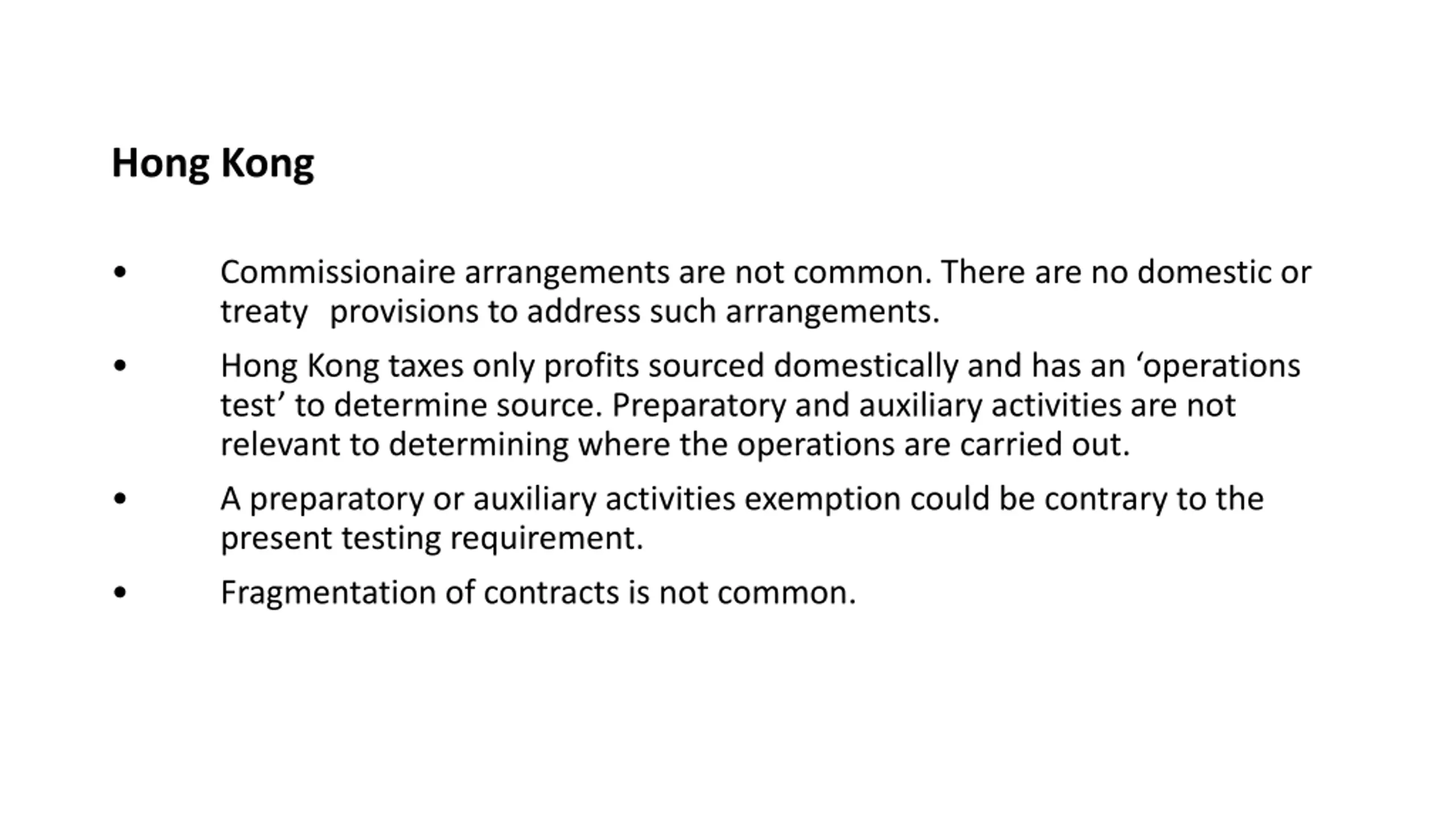 Hong Kong Commissionaire arrangements are not common. There are no domestic or treaty provisions to address such arrangements. Hong Kong taxes only profits sourced domestically and has an operations test to determine source. Preparatory and auxiliary activities are not relevant to determining where the operations are carried out. A preparatory or auxiliary activities exemption could be contrary to the present testing requirement. Fragmentation of contracts is not common.