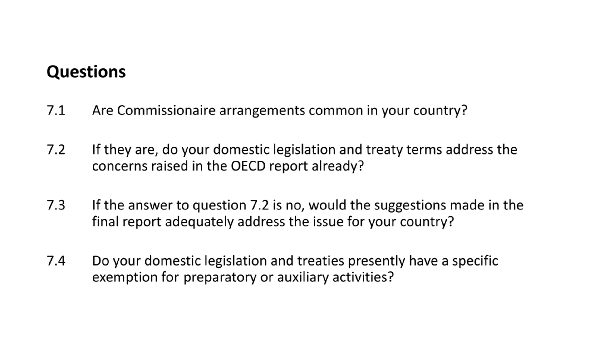 Questions 7.1 Are Commissionaire arrangements common in your country? 7.2 If they are, do your domestic legislation and treaty terms address the concerns raised in the OECD report already? 7.3 If the answer to question 7.2 is no, would the suggestions made in the final report adequately address the issue for your country? 7.4 Do your domestic legislation and treaties presently have a specific exemption for preparatory or auxiliary activities?