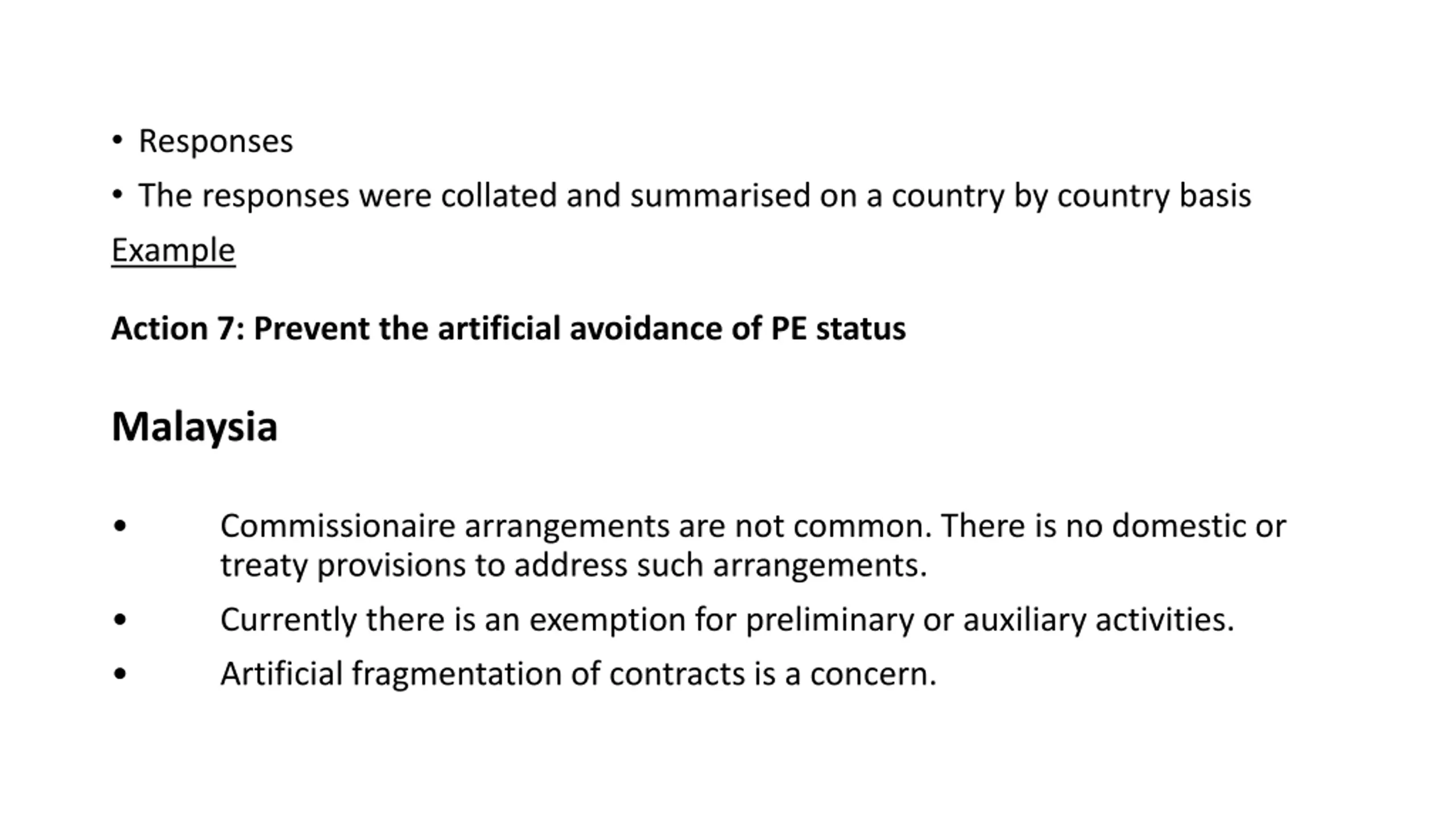 Responses The responses were collated and summarised on a country by country basis Example Action 7: Prevent the artificial avoidance of PE status Malaysia Commissionaire arrangements are not common. There is no domestic or treaty provisions to address such arrangements. Currently there is an exemption for preliminary or auxiliary activities. Artificial fragmentation of contracts is a concern.