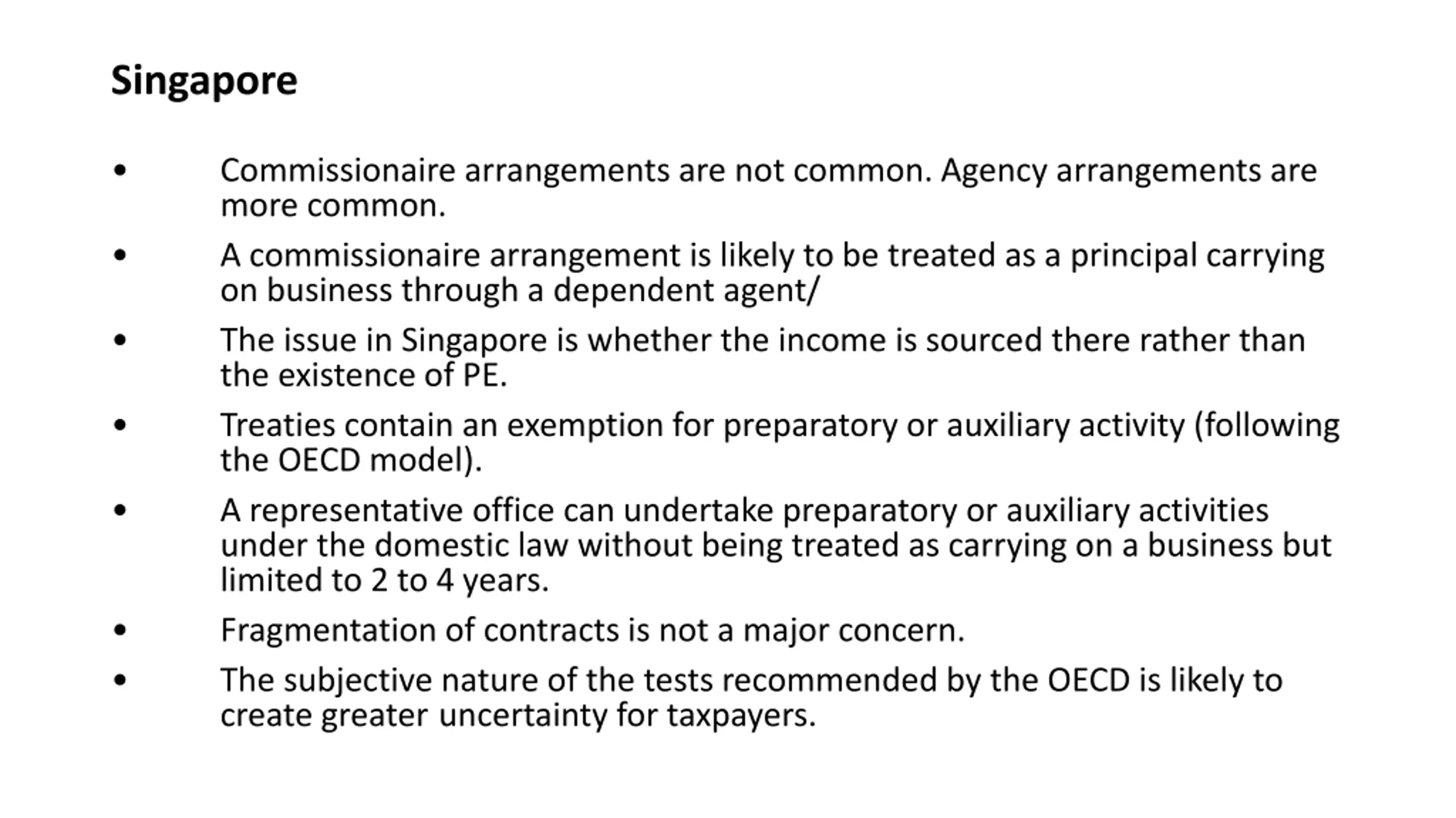 Singapore Commissionaire arrangements are not common. Agency arrangements are more common. A commissionaire arrangement is likely to be treated as a principal carrying on business through a dependent agent/ The issue in Singapore is whether the income is sourced there rather than the existence of PE. Treaties contain an exemption for preparatory or auxiliary activity (following the OECD model). A representative office can undertake preparatory or auxiliary activities under the domestic law without being treated as carrying on a business but limited to 2 to 4 years. Fragmentation of contracts is not a major concern. The subjective nature of the tests recommended by the OECD is likely to create greater uncertainty for taxpayers.