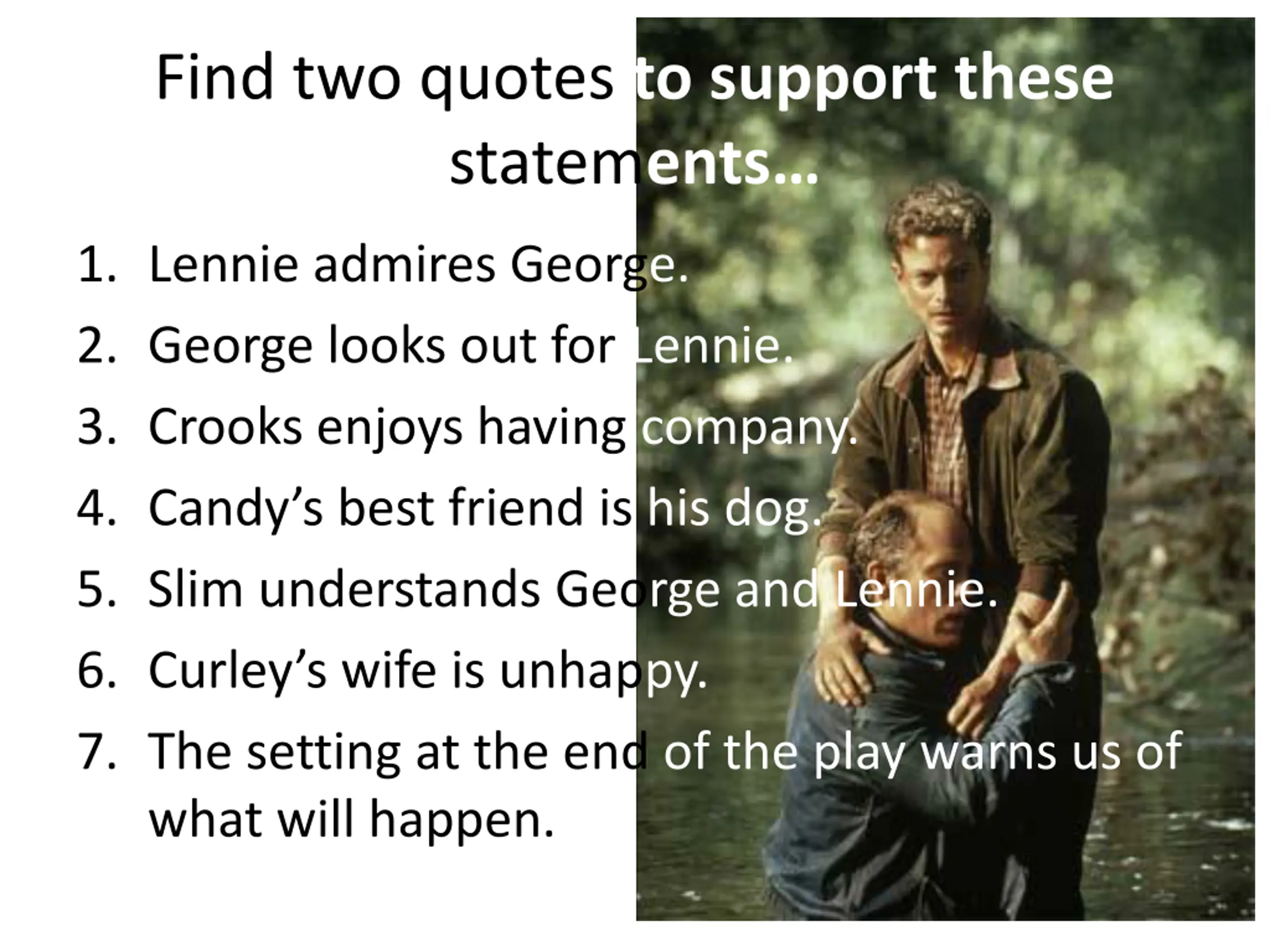 Find two quotes to support these statements 1. Lennie admires George. 2. George looks out for Lennie. 3. Crooks enjoys having company. 4. Candy s best friend is his dog. 5. Slim understands George and Lennie. 6. Curley s wife is unhappy. 7. The setting at the end of the play warns us of what will happen.