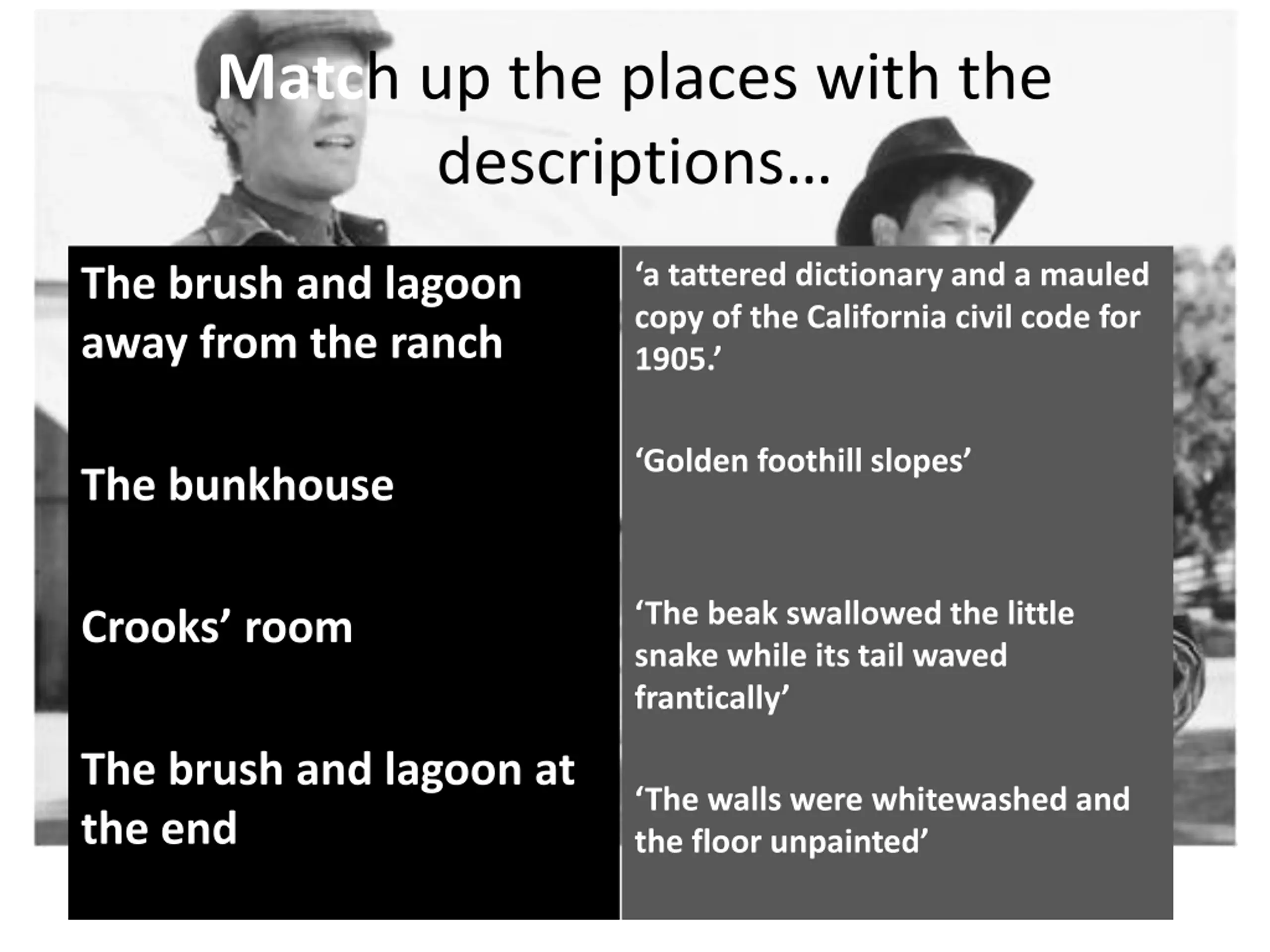 Match up the places with the descriptions a tattered dictionary and a mauled copy of the California civil code for 1905. The brush and lagoon away from the ranch Golden foothill slopes The bunkhouse The beak swallowed the little snake while its tail waved frantically Crooks room The brush and lagoon at the end The walls were whitewashed and the floor unpainted