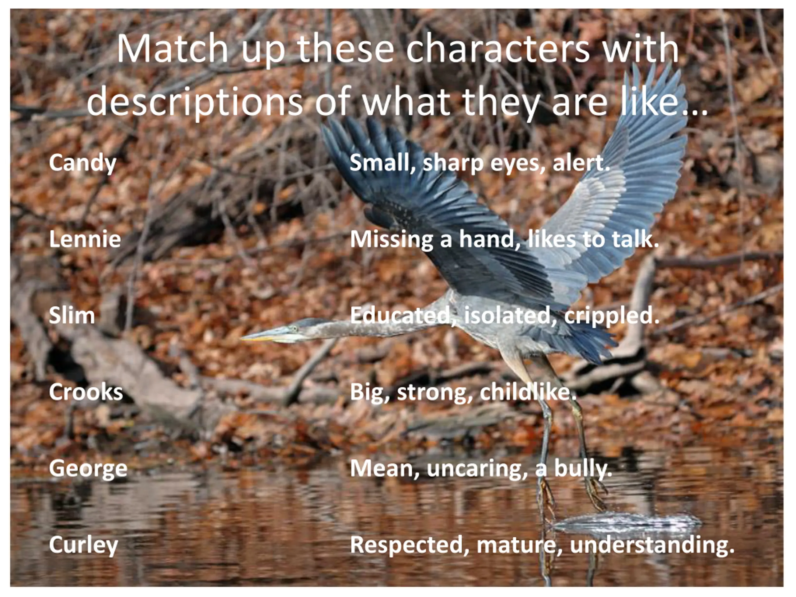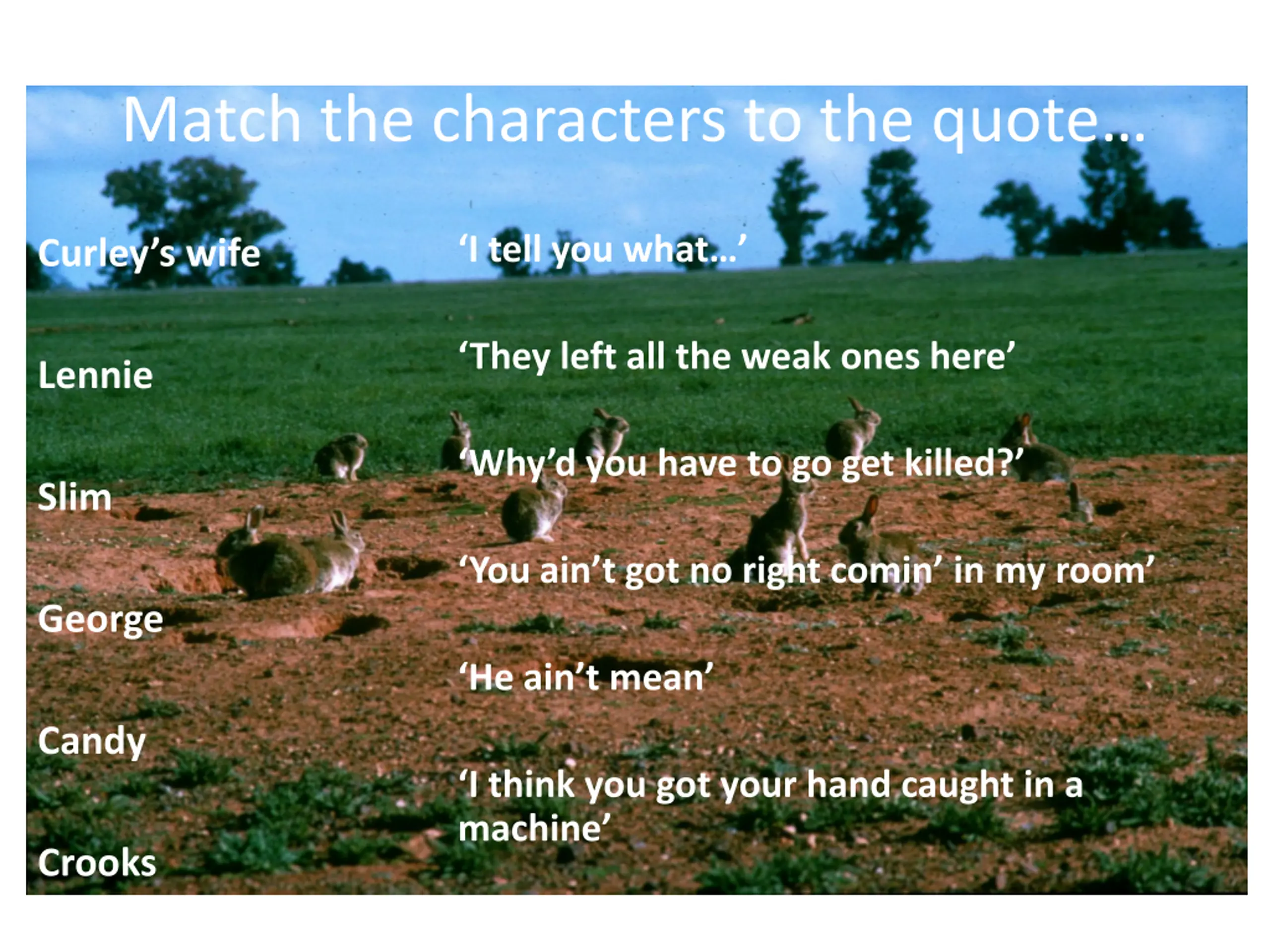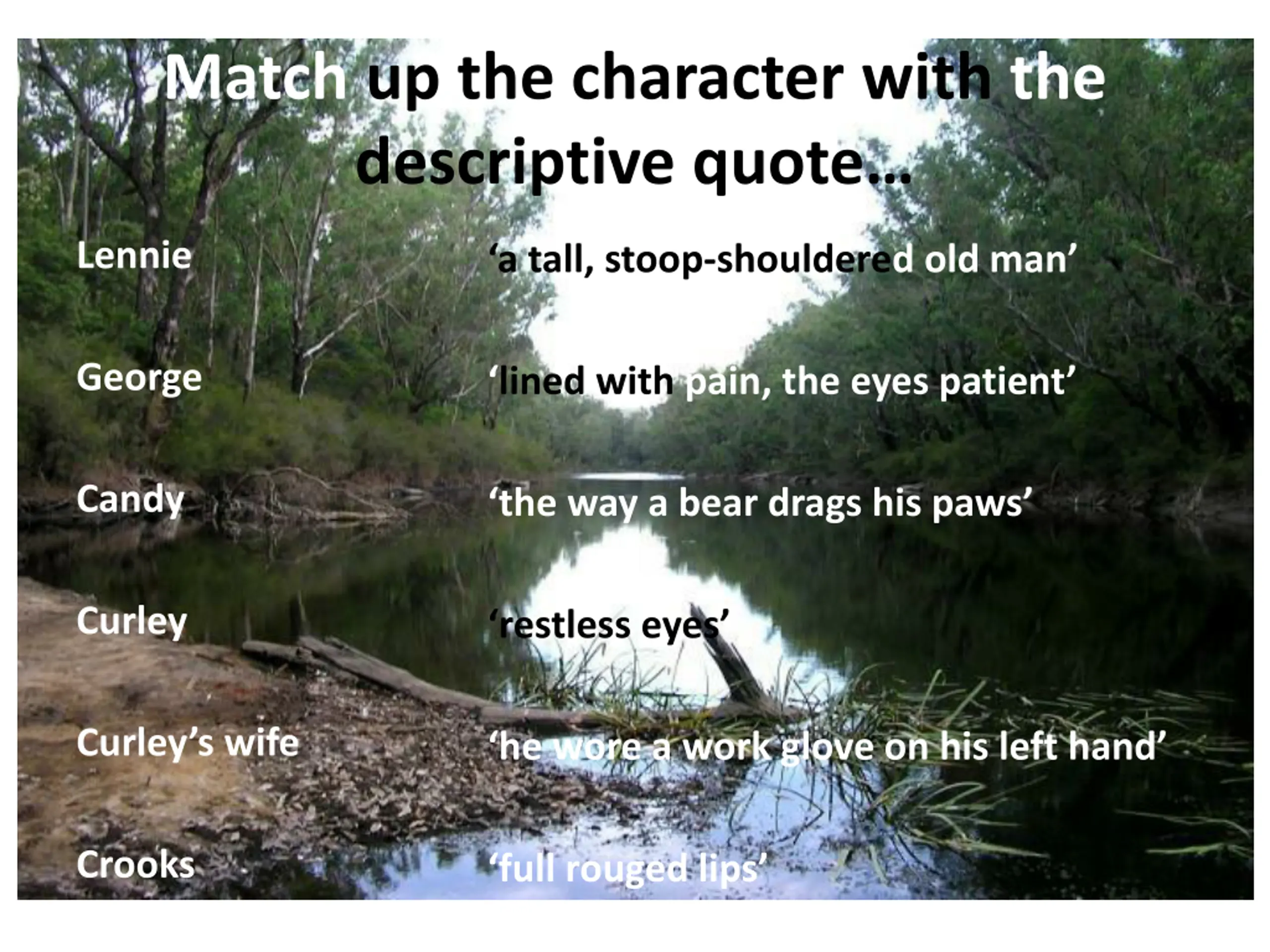 Match up the character with the descriptive quote Lennie a tall, stoop-shouldered old man George lined with pain, the eyes patient Candy the way a bear drags his paws Curley restless eyes Curley s wife he wore a work glove on his left hand Crooks full rouged lips