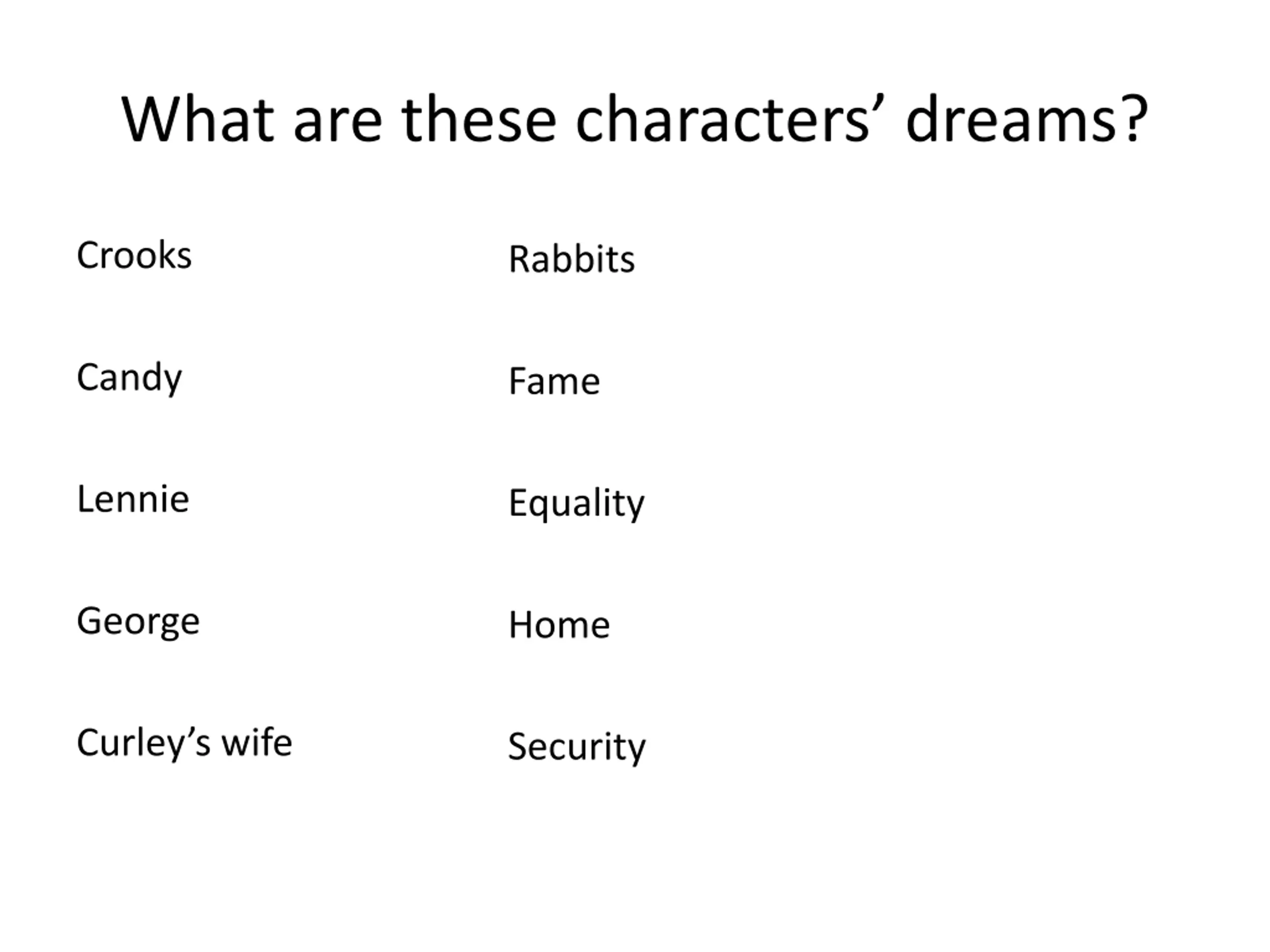 What are these characters dreams? Crooks Rabbits Candy Fame Lennie Equality George Home Curley s wife Security