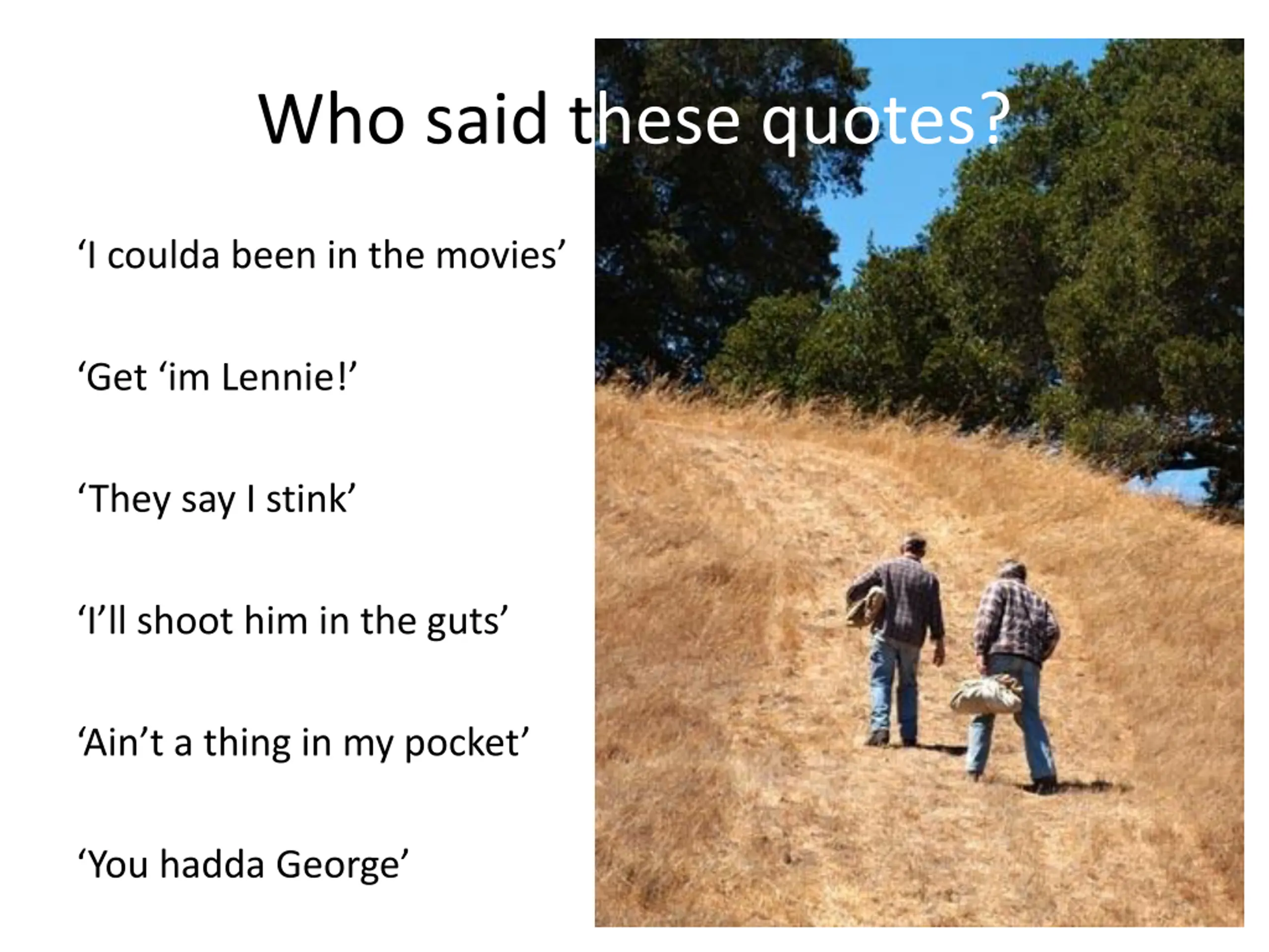 Who said these quotes? I coulda been in the movies Get im Lennie! They say I stink I ll shoot him in the guts Ain t a thing in my pocket You hadda George