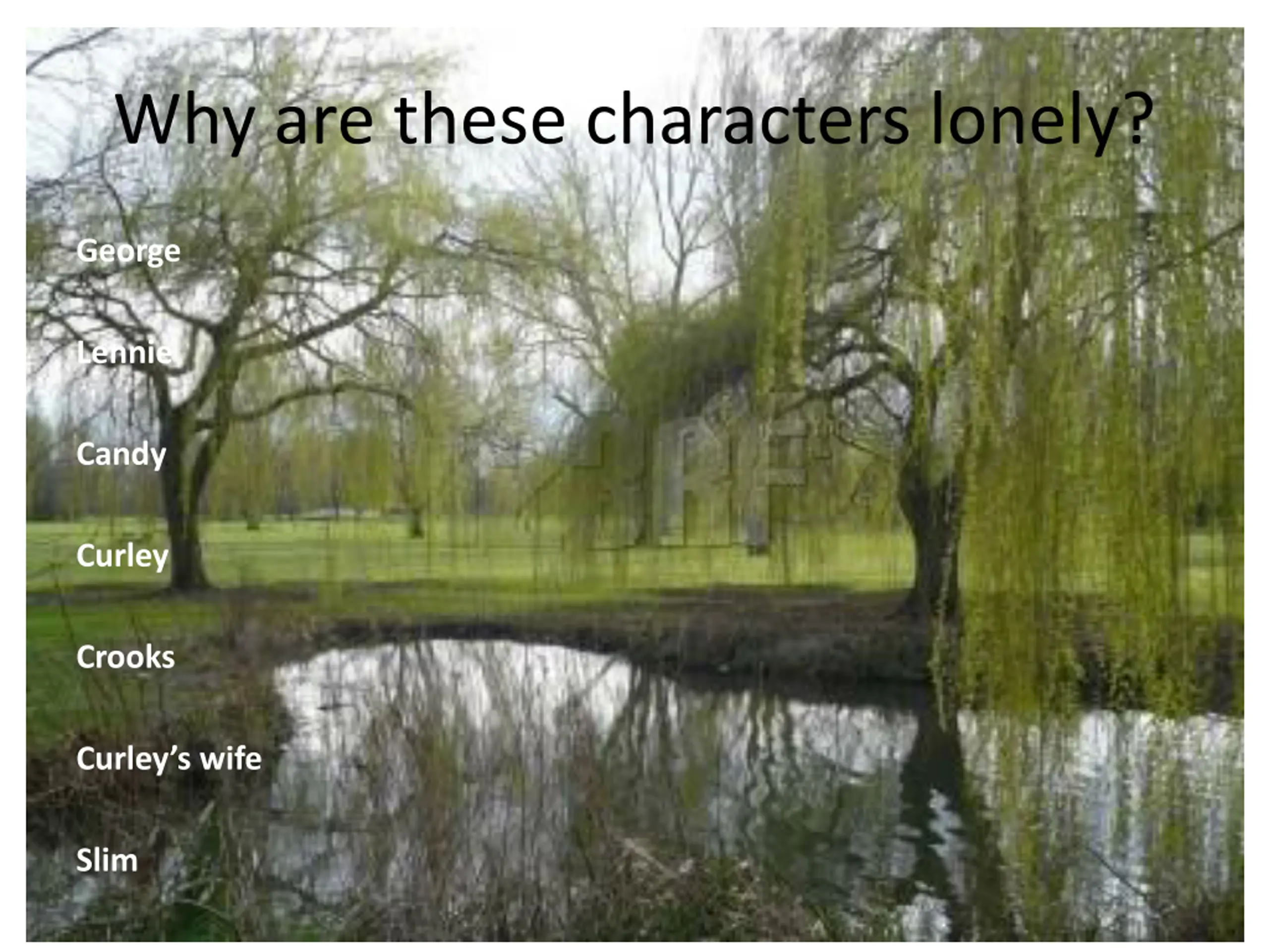 Why are these characters lonely? George Lennie Candy Curley Crooks Curley s wife Slim