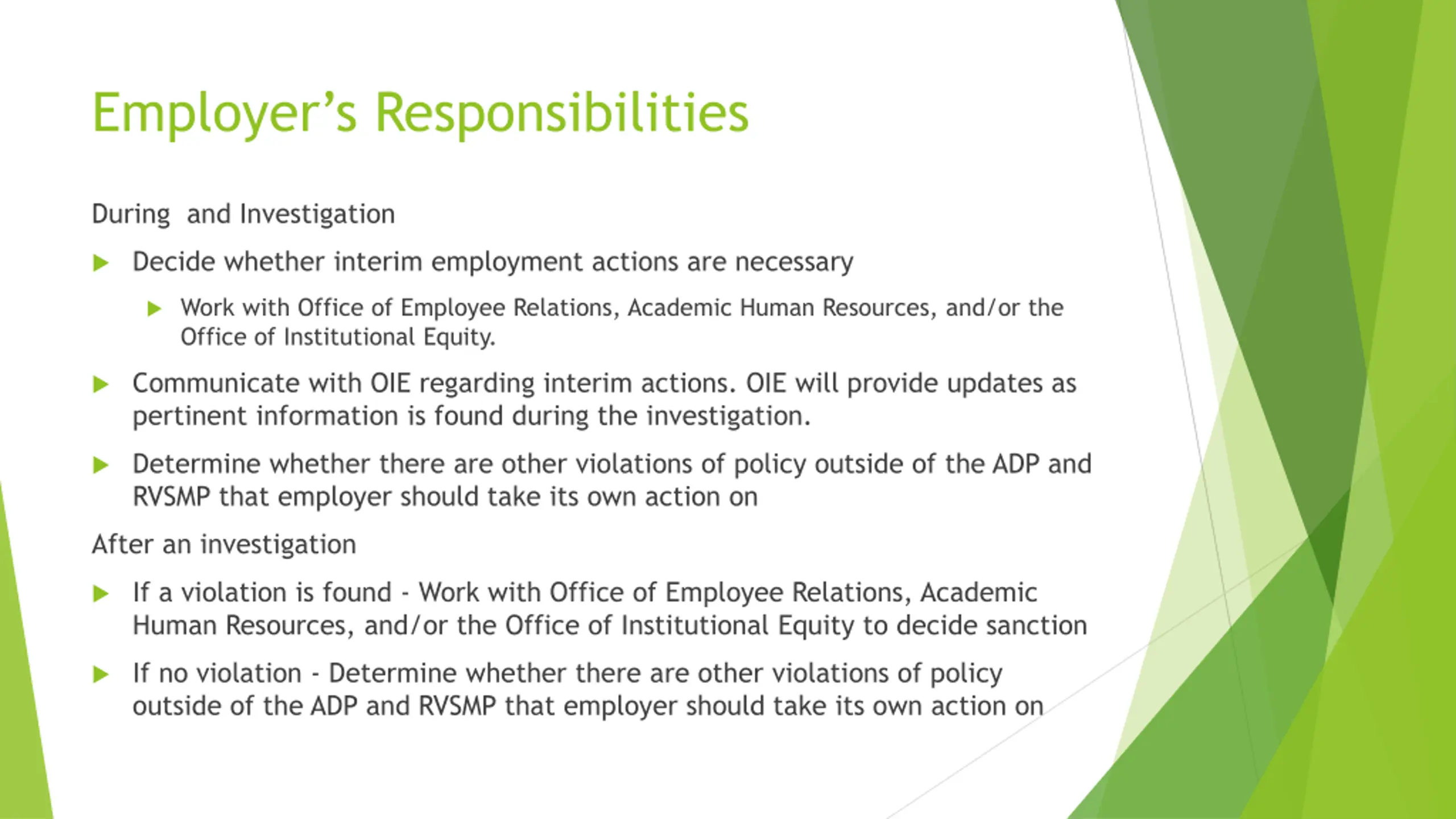 Employers Responsibilities During and Investigation Decide whether interim employment actions are necessary Work with Office of Employee Relations, Academic Human Resources, and/or the Office of Institutional Equity. Communicate with OIE regarding interim actions. OIE will provide updates as pertinent information is found during the investigation. Determine whether there are other violations of policy outside of the ADP and RVSMP that employer should take its own action on After an investigation If a violation is found - Work with Office of Employee Relations, Academic Human Resources, and/or the Office of Institutional Equity to decide sanction If no violation - Determine whether there are other violations of policy outside of the ADP and RVSMP that employer should take its own action on