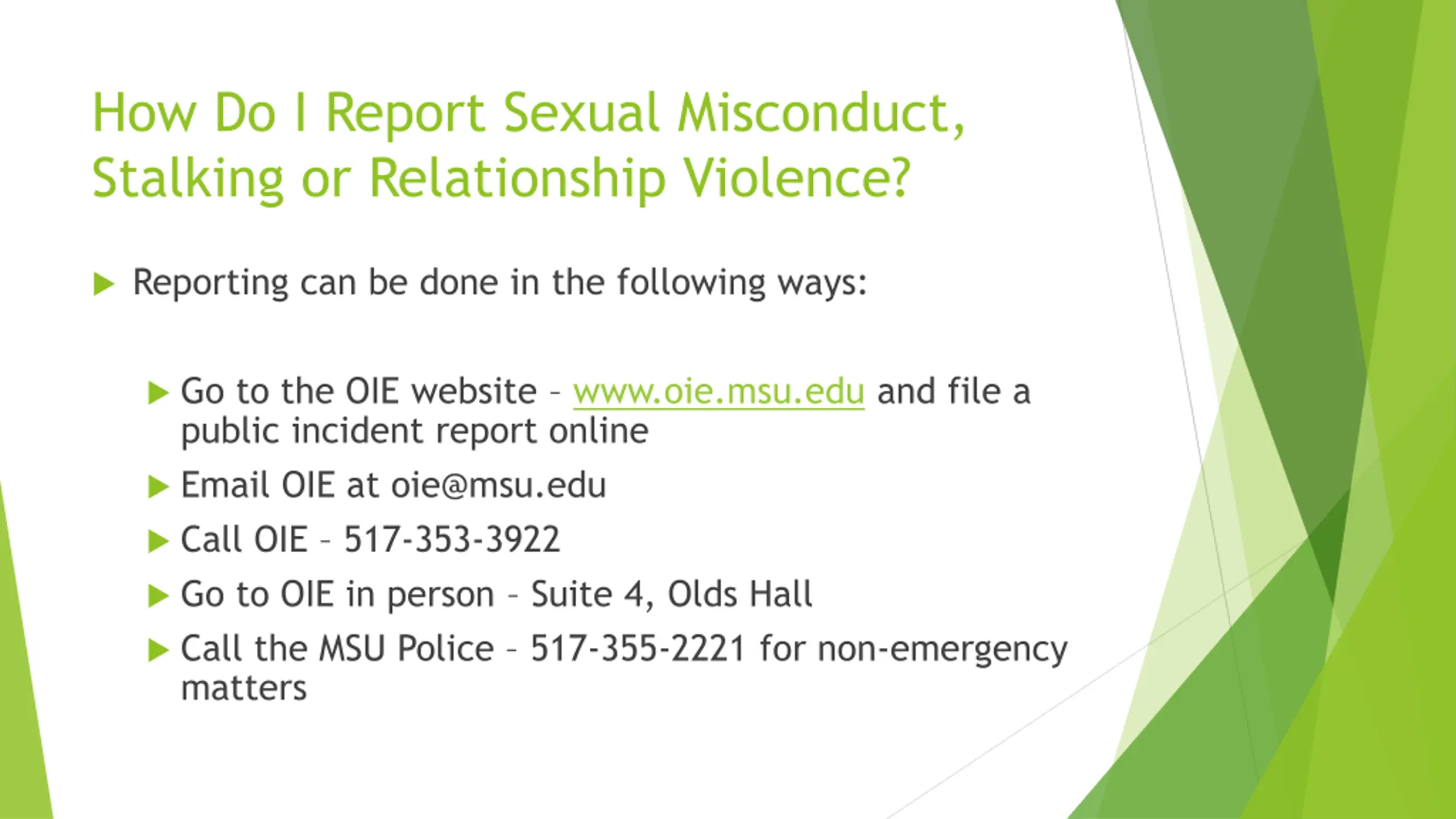 How Do I Report Sexual Misconduct, Stalking or Relationship Violence? Reporting can be done in the following ways: Go to the OIE website www.oie.msu.edu and file a public incident report online Email OIE at oie@msu.edu Call OIE 517-353-3922 Go to OIE in person Suite 4, Olds Hall Call the MSU Police 517-355-2221 for non-emergency matters