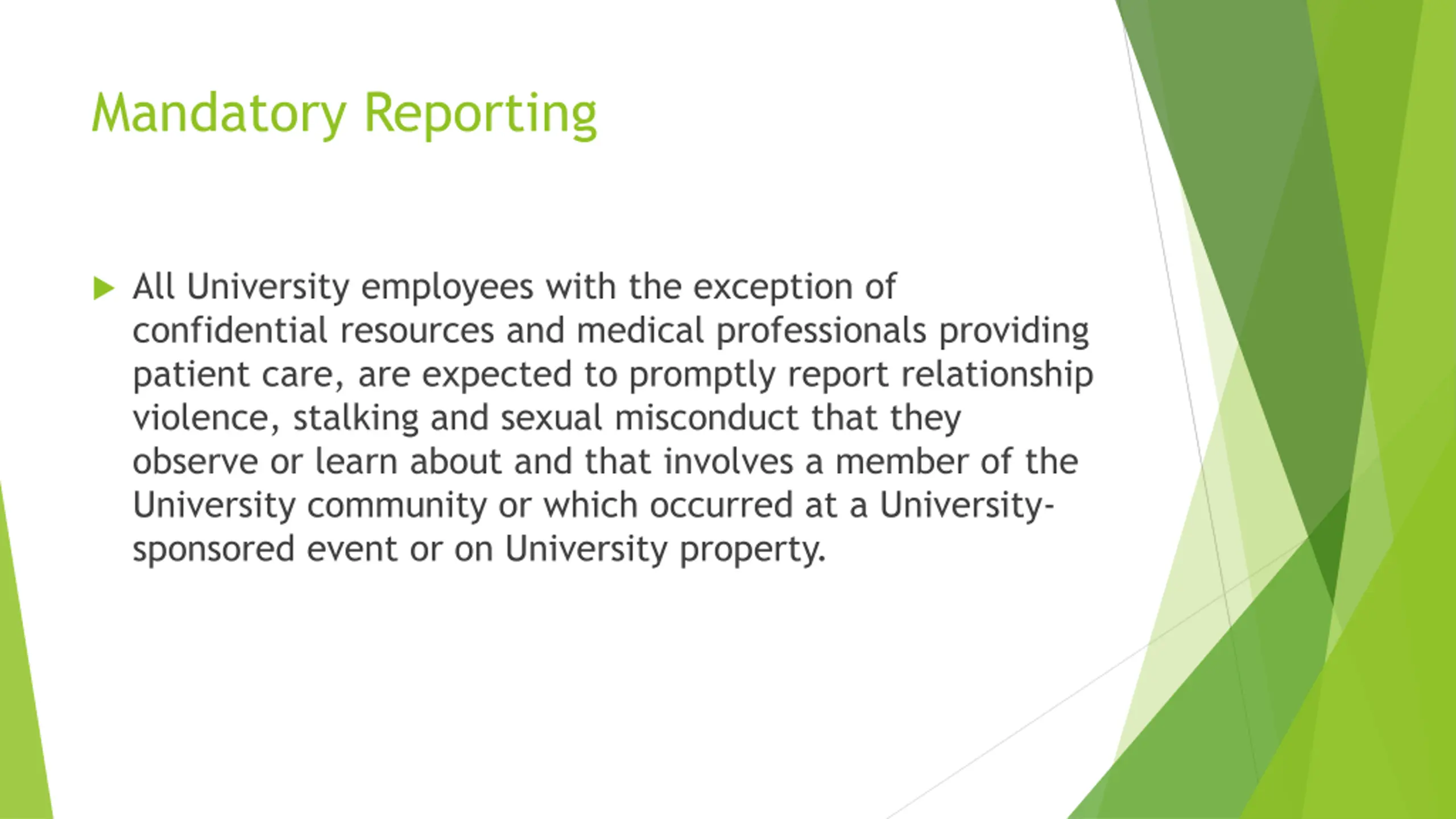 Mandatory Reporting All University employees with the exception of confidential resources and medical professionals providing patient care, are expected to promptly report relationship violence, stalking and sexual misconduct that they observe or learn about and that involves a member of the University community or which occurred at a University- sponsored event or on University property.
