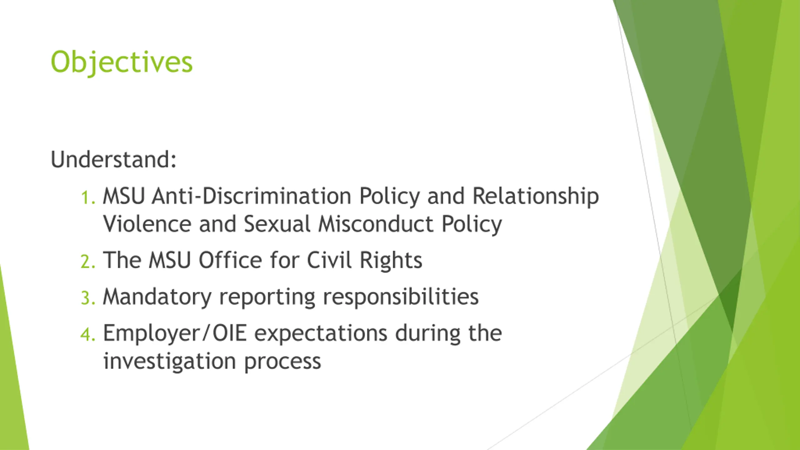 Objectives Understand: 1. MSU Anti-Discrimination Policy and Relationship Violence and Sexual Misconduct Policy 2. The MSU Office for Civil Rights 3. Mandatory reporting responsibilities 4. Employer/OIE expectations during the investigation process