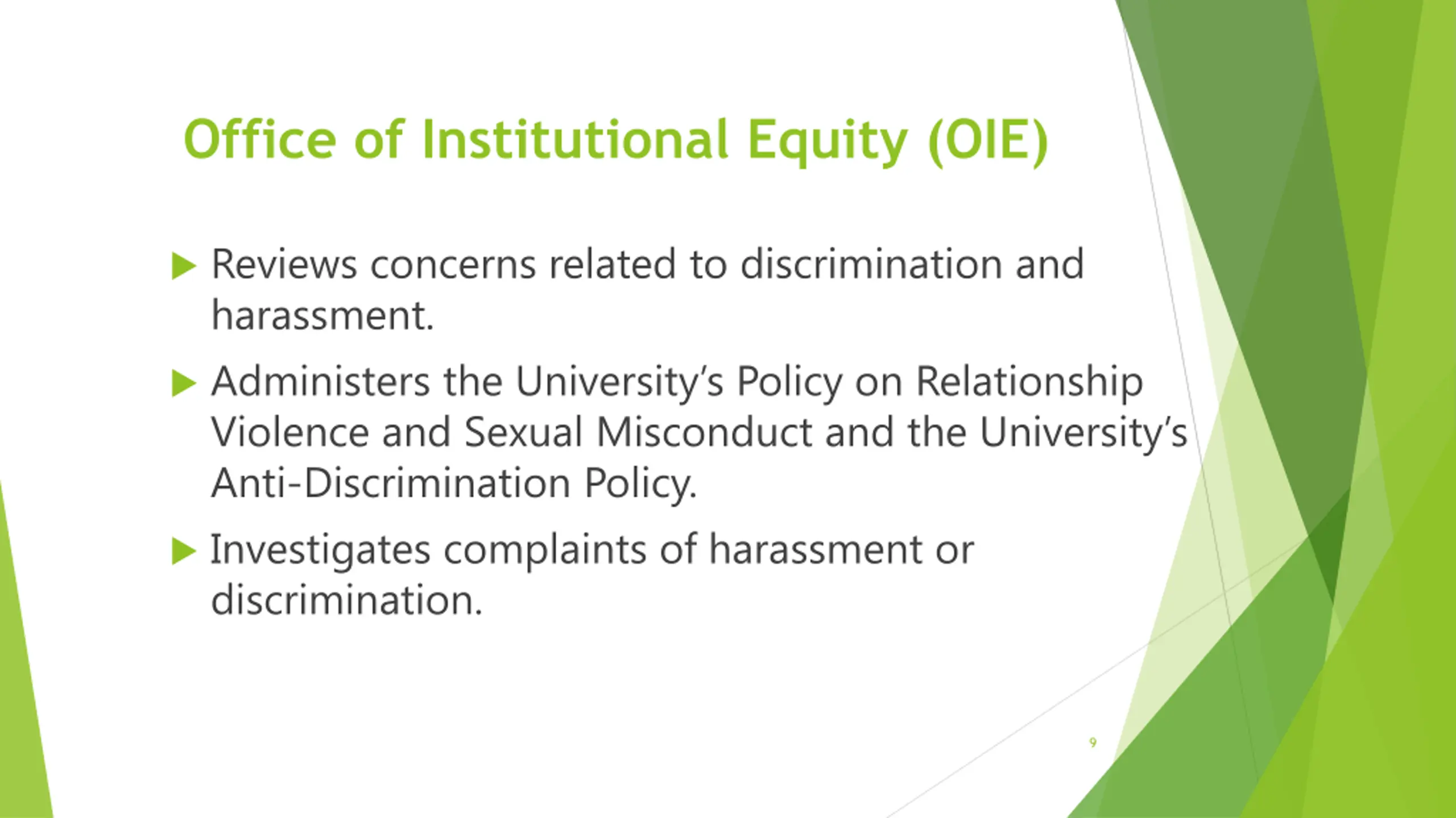 Office of Institutional Equity (OIE) Reviews concerns related to discrimination and harassment. Administers the University s Policy on Relationship Violence and Sexual Misconduct and the University s Anti-Discrimination Policy. Investigates complaints of harassment or discrimination. 9