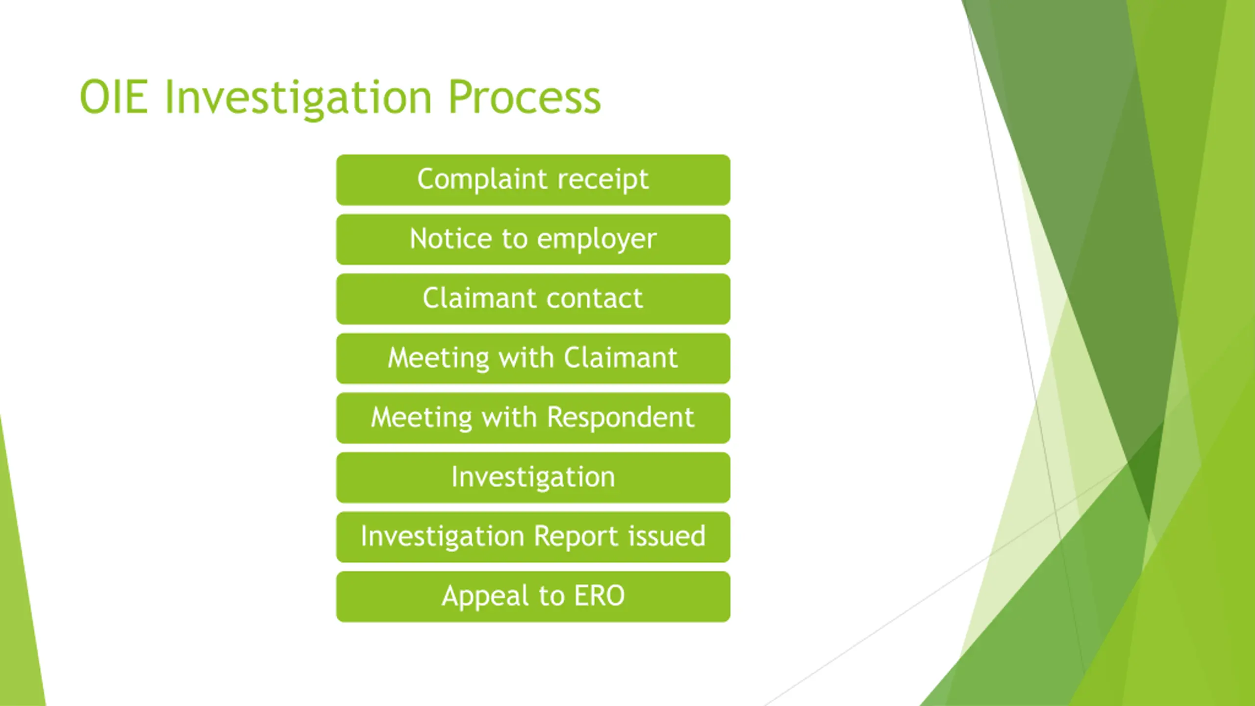 OIE Investigation Process Complaint receipt Notice to employer Claimant contact Meeting with Claimant Meeting with Respondent Investigation Investigation Report issued Appeal to ERO