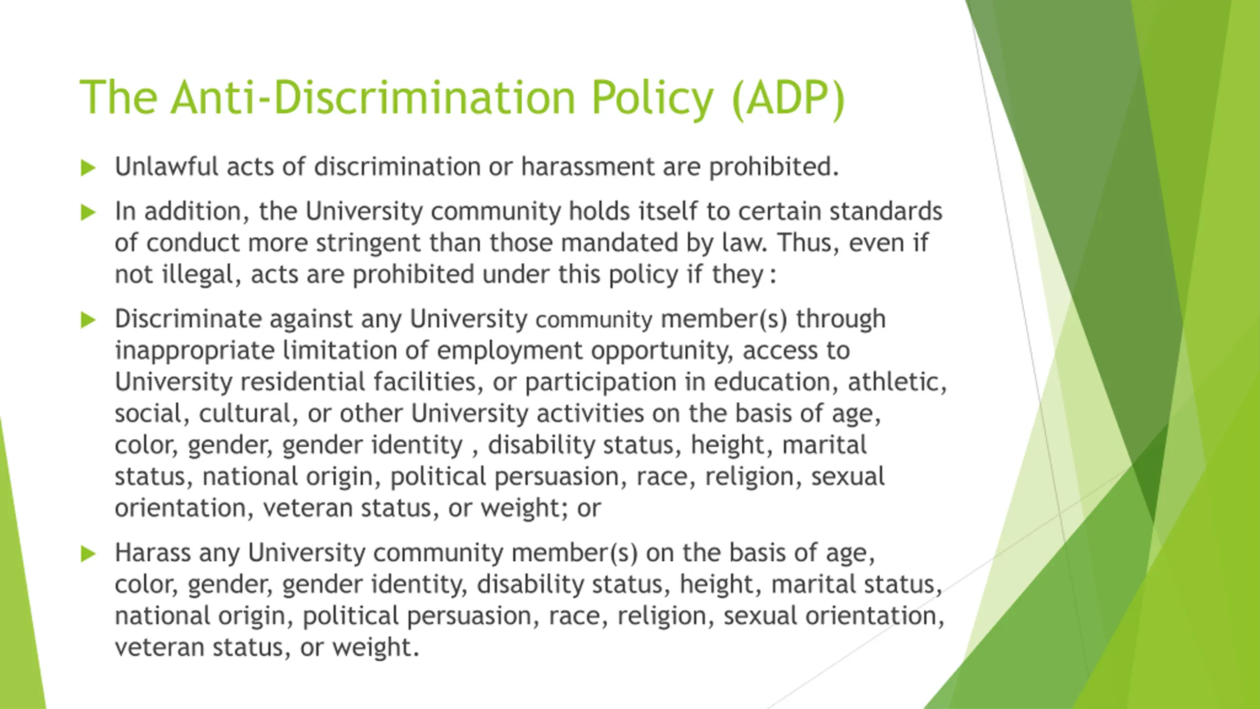 The Anti-Discrimination Policy (ADP) Unlawful acts of discrimination or harassment are prohibited. In addition, the University community holds itself to certain standards of conduct more stringent than those mandated by law. Thus, even if not illegal, acts are prohibited under this policy if they: Discriminate against any University community member(s) through inappropriate limitation of employment opportunity, access to University residential facilities, or participation in education, athletic, social, cultural, or other University activities on the basis of age, color, gender, gender identity , disability status, height, marital status, national origin, political persuasion, race, religion, sexual orientation, veteran status, or weight; or Harass any University community member(s) on the basis of age, color, gender, gender identity, disability status, height, marital status, national origin, political persuasion, race, religion, sexual orientation, veteran status, or weight.