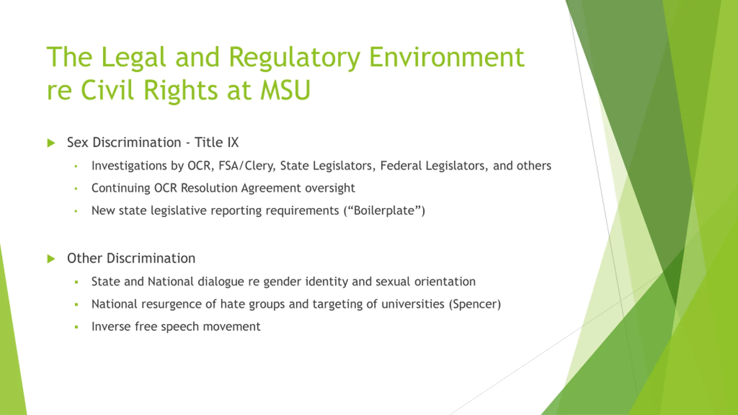 The Legal and Regulatory Environment re Civil Rights at MSU Sex Discrimination - Title IX Investigations by OCR, FSA/Clery, State Legislators, Federal Legislators, and others Continuing OCR Resolution Agreement oversight New state legislative reporting requirements ( Boilerplate ) Other Discrimination State and National dialogue re gender identity and sexual orientation National resurgence of hate groups and targeting of universities (Spencer) Inverse free speech movement