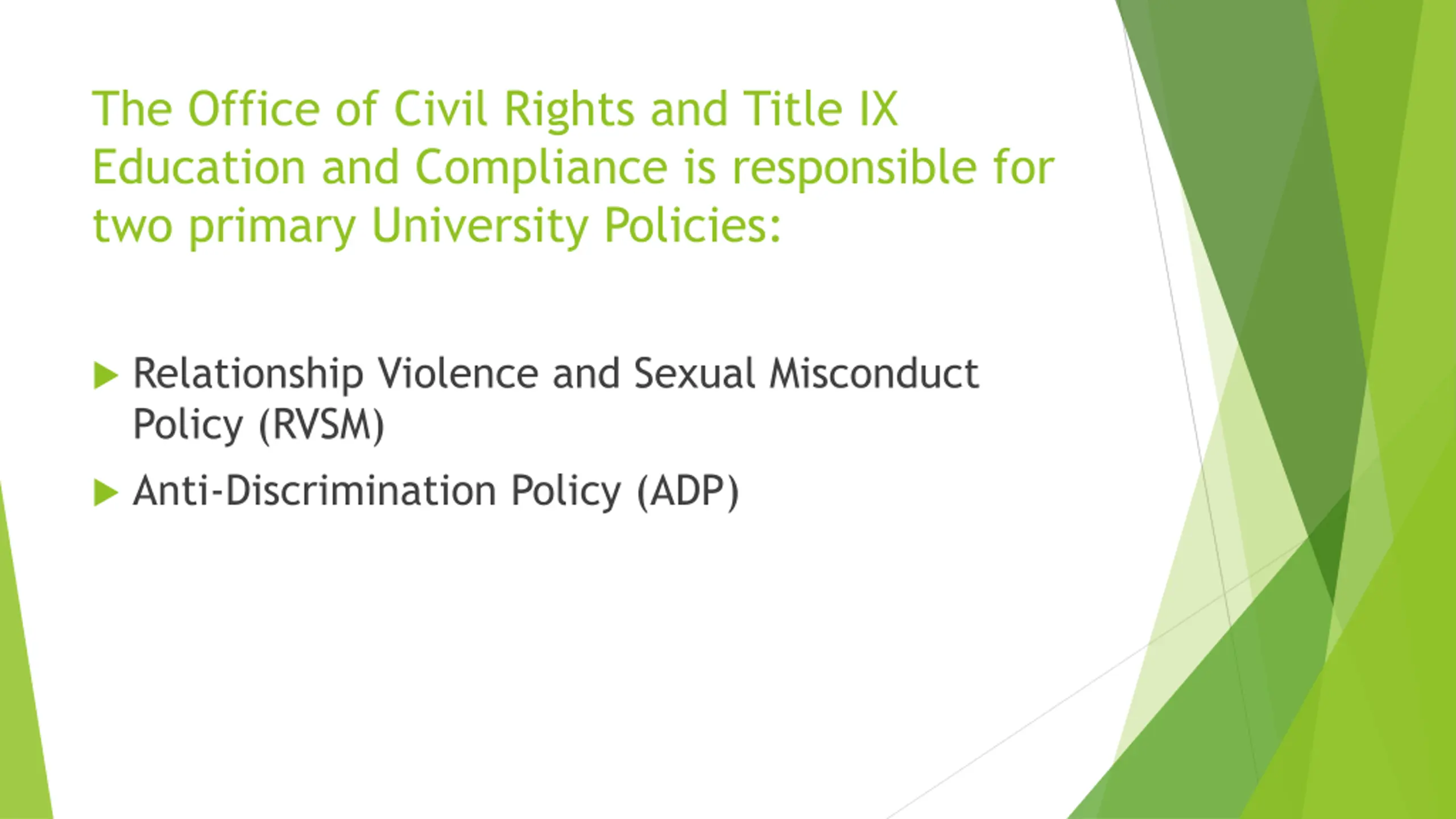 The Office of Civil Rights and Title IX Education and Compliance is responsible for two primary University Policies: Relationship Violence and Sexual Misconduct Policy (RVSM) Anti-Discrimination Policy (ADP)