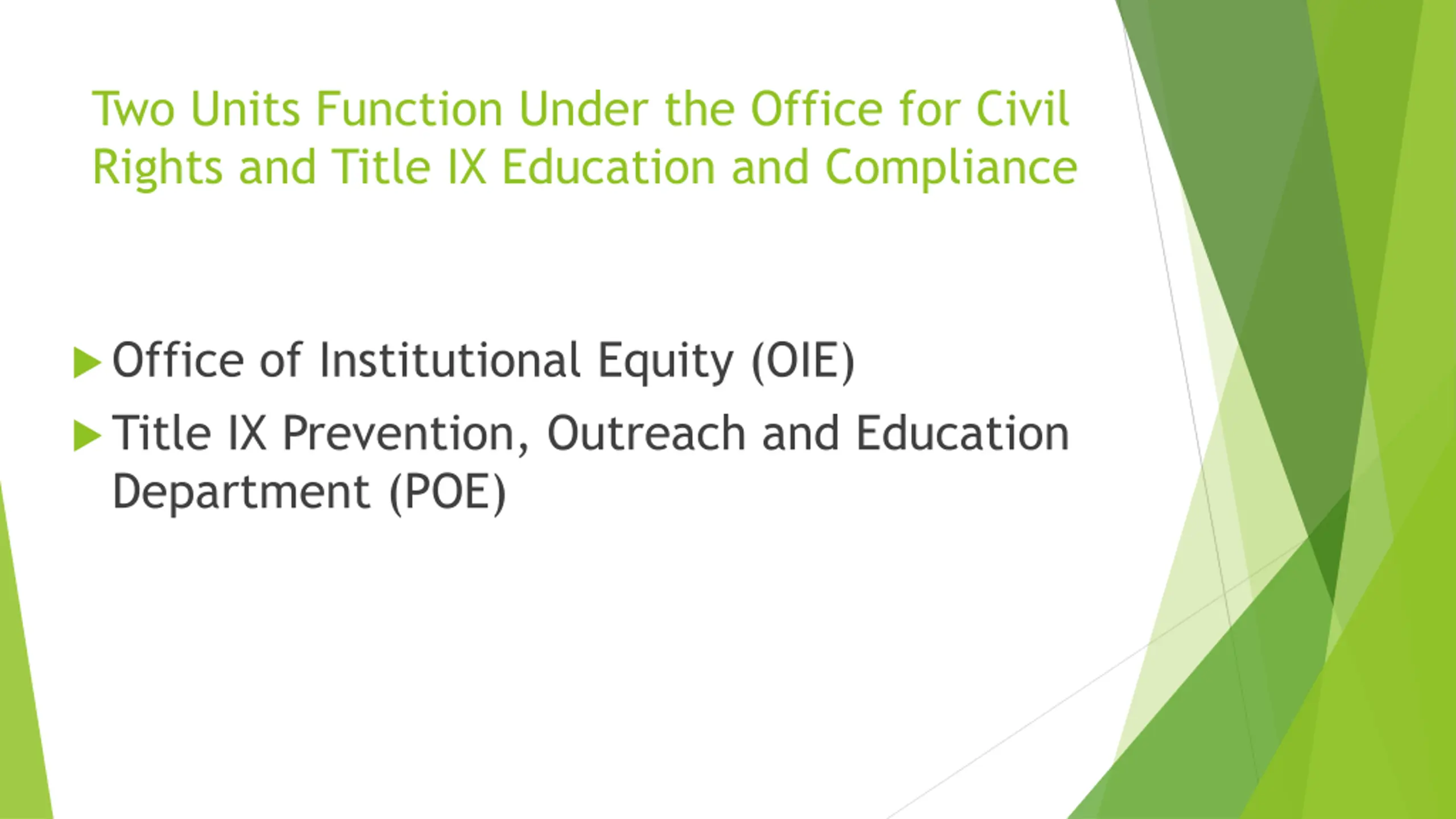 Two Units Function Under the Office for Civil Rights and Title IX Education and Compliance Office of Institutional Equity (OIE) Title IX Prevention, Outreach and Education Department (POE)