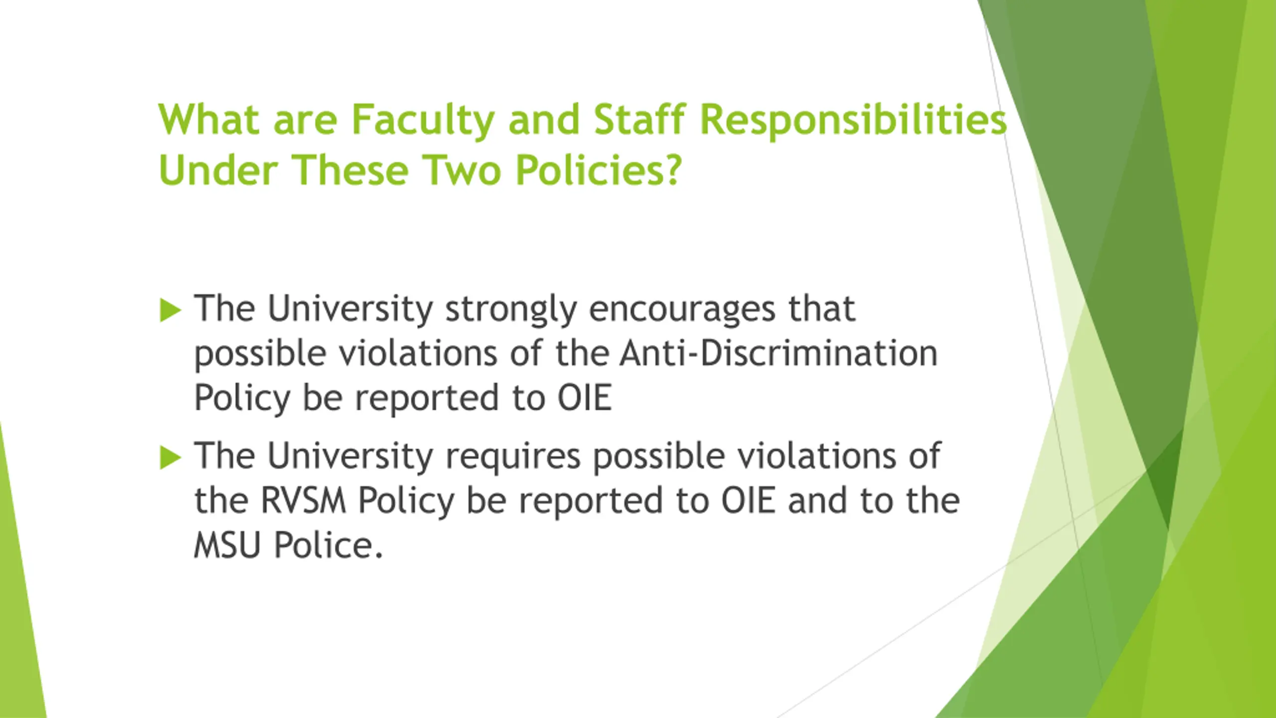 What are Faculty and Staff Responsibilities Under These Two Policies? The University strongly encourages that possible violations of the Anti-Discrimination Policy be reported to OIE The University requires possible violations of the RVSM Policy be reported to OIE and to the MSU Police.