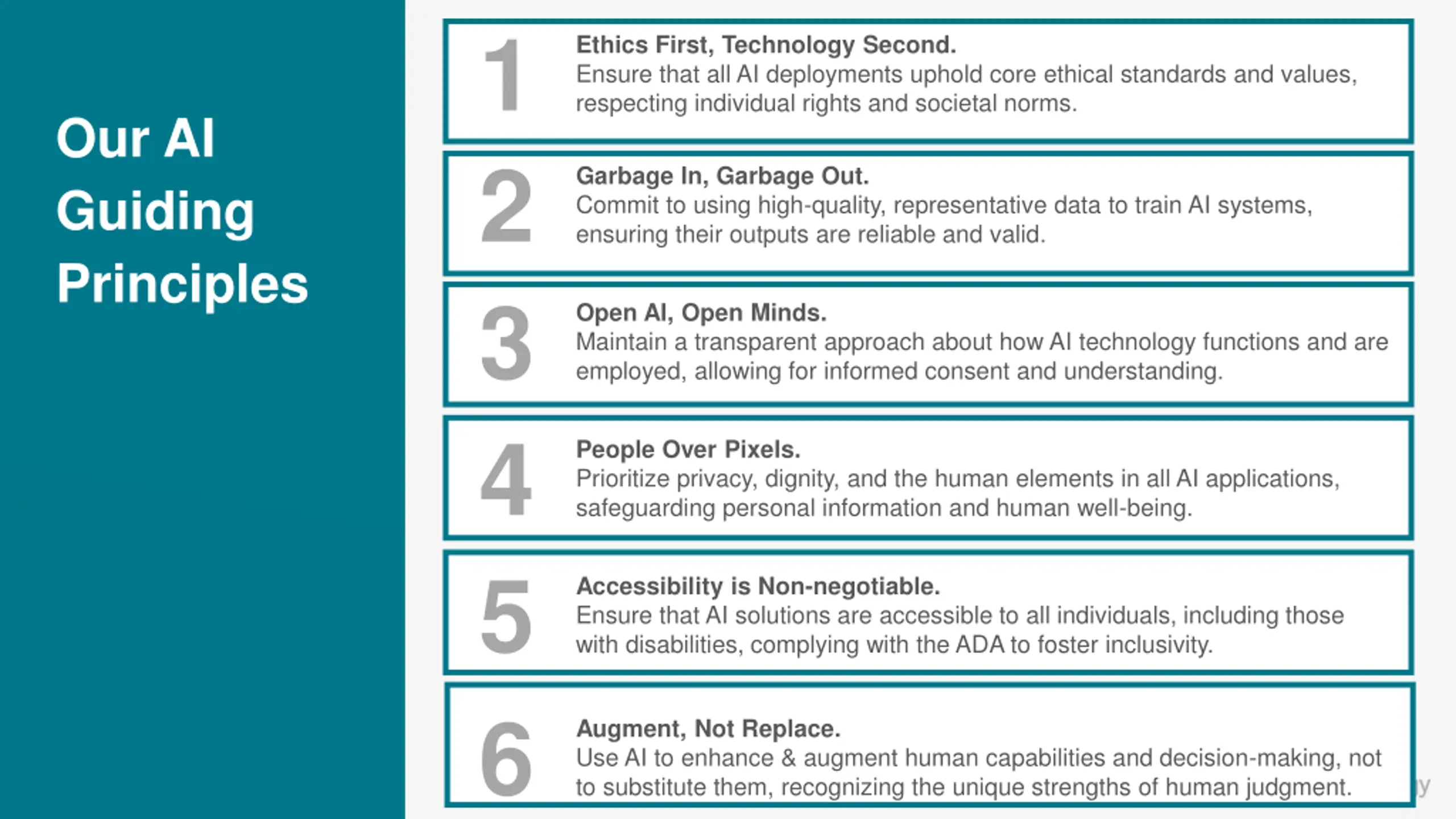 1 2 3 4 5 6 Ethics First, Technology Second. Ensure that all AI deployments uphold core ethical standards and values, respecting individual rights and societal norms. Our AI Guiding Principles Garbage In, Garbage Out. Commit to using high-quality, representative data to train AI systems, ensuring their outputs are reliable and valid. Open AI, Open Minds. Maintain a transparent approach about how AI technology functions and are employed, allowing for informed consent and understanding. People Over Pixels. Prioritize privacy, dignity, and the human elements in all AI applications, safeguarding personal information and human well-being. Accessibility is Non-negotiable. Ensure that AI solutions are accessible to all individuals, including those with disabilities, complying with the ADA to foster inclusivity. Augment, Not Replace. Use AI to enhance & augment human capabilities and decision-making, not to substitute them, recognizing the unique strengths of human judgment.