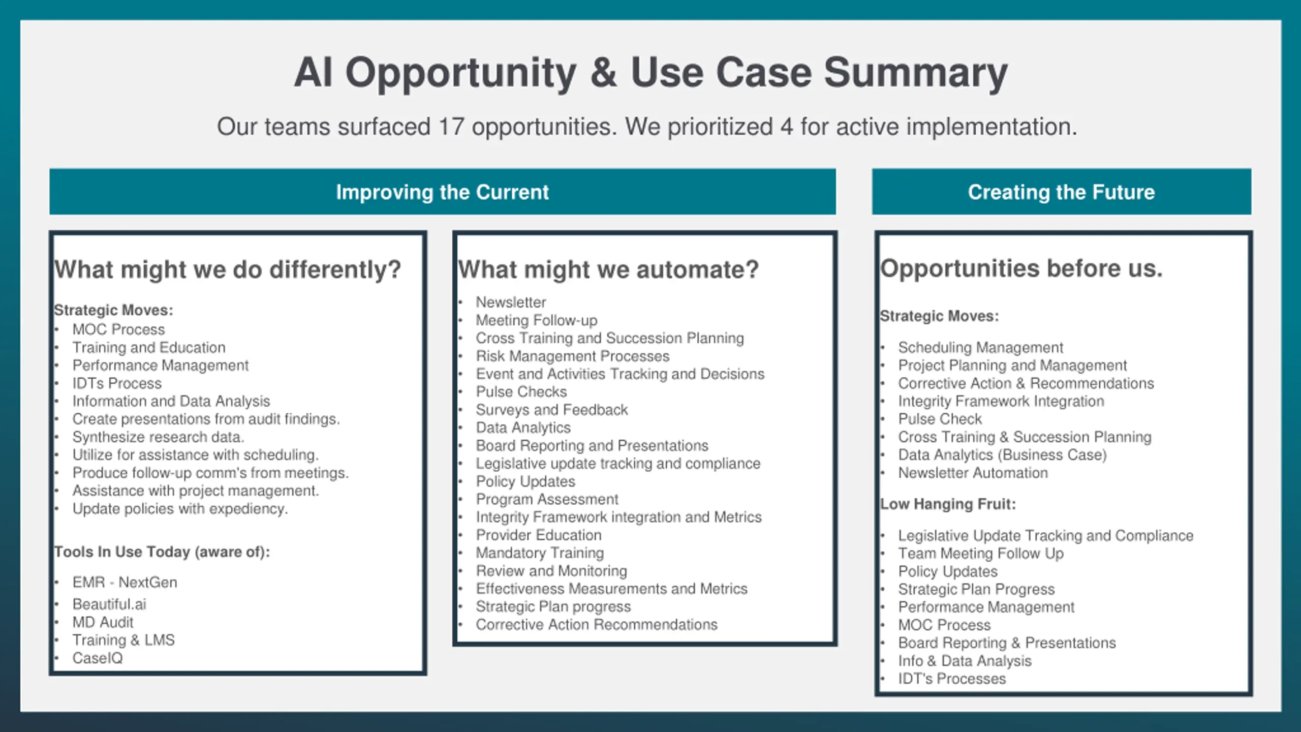 AI Opportunity & Use Case Summary Our teams surfaced 17 opportunities. We prioritized 4 for active implementation. Improving the Current Creating the Future Opportunities before us. What might we do differently? What might we automate? Newsletter Meeting Follow-up Cross Training and Succession Planning Risk Management Processes Event and Activities Tracking and Decisions Pulse Checks Surveys and Feedback Data Analytics Board Reporting and Presentations Legislative update tracking and compliance Policy Updates Program Assessment Integrity Framework integration and Metrics Provider Education Mandatory Training Review and Monitoring Effectiveness Measurements and Metrics Strategic Plan progress Corrective Action Recommendations Strategic Moves: MOC Process Training and Education Performance Management IDTs Process Information and Data Analysis Create presentations from audit findings. Synthesize research data. Utilize for assistance with scheduling. Produce follow-up comm's from meetings. Assistance with project management. Update policies with expediency. Strategic Moves: Scheduling Management Project Planning and Management Corrective Action & Recommendations Integrity Framework Integration Pulse Check Cross Training & Succession Planning Data Analytics (Business Case) Newsletter Automation Low Hanging Fruit: Legislative Update Tracking and Compliance Team Meeting Follow Up Policy Updates Strategic Plan Progress Performance Management MOC Process Board Reporting & Presentations Info & Data Analysis IDT's Processes Tools In Use Today (aware of): EMR - NextGen Beautiful.ai MD Audit Training & LMS CaseIQ