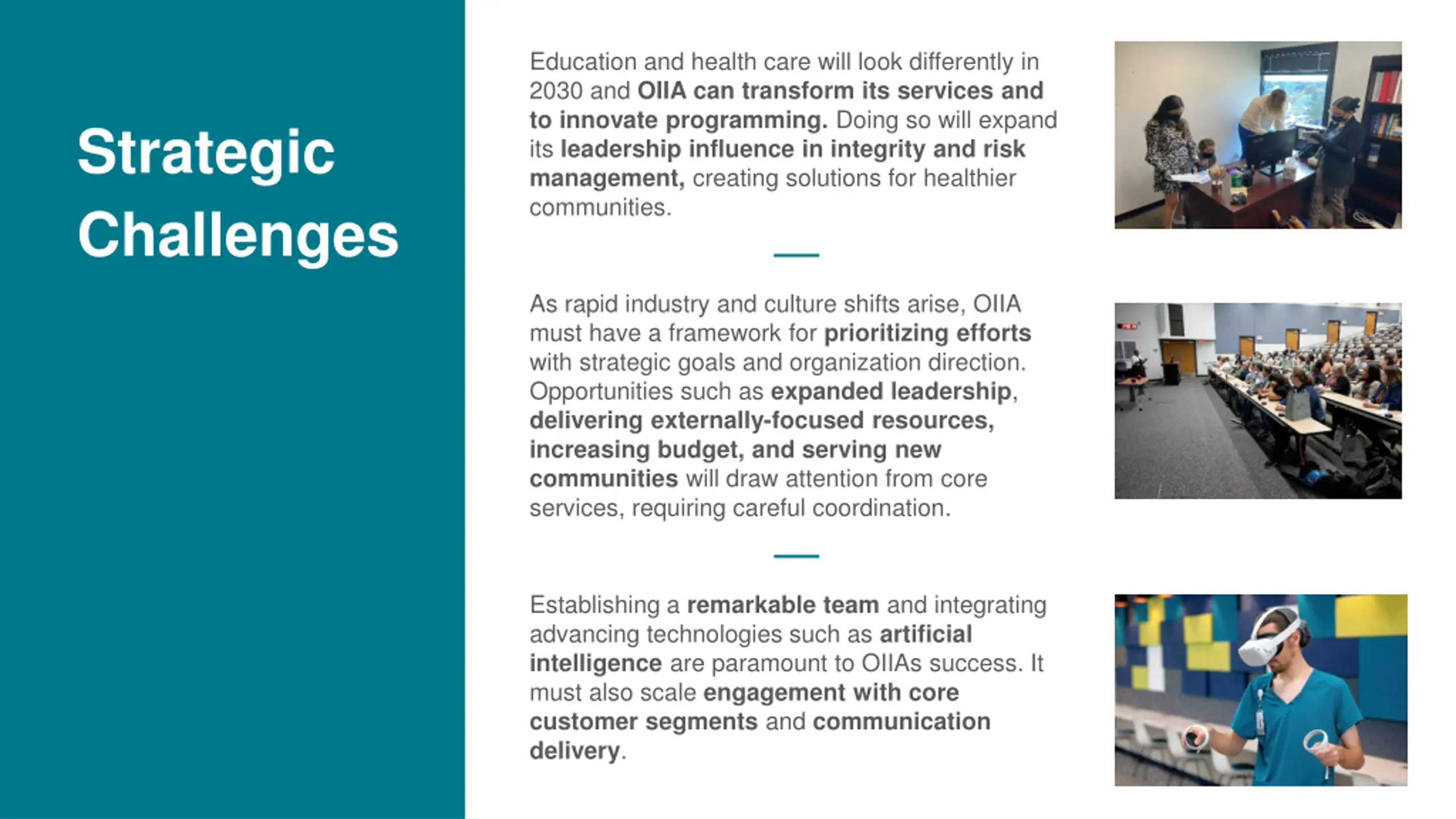 Education and health care will look differently in 2030 and OIIA can transform its services and to innovate programming. Doing so will expand its leadership influence in integrity and risk management, creating solutions for healthier communities. Strategic Challenges As rapid industry and culture shifts arise, OIIA must have a framework for prioritizing efforts with strategic goals and organization direction. Opportunities such as expanded leadership, delivering externally-focused resources, increasing budget, and serving new communities will draw attention from core services, requiring careful coordination. Establishing a remarkable team and integrating advancing technologies such as artificial intelligence are paramount to OIIAs success. It must also scale engagement with core customer segments and communication delivery.