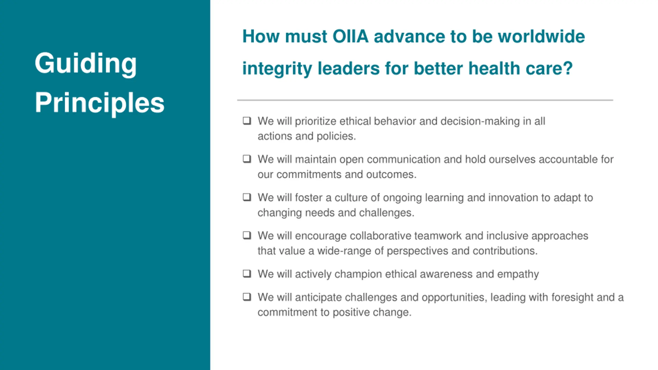 How must OIIA advance to be worldwide Guiding Principles integrity leaders for better health care? We will prioritize ethical behavior and decision-making in all actions and policies. We will maintain open communication and hold ourselves accountable for our commitments and outcomes. We will foster a culture of ongoing learning and innovation to adapt to changing needs and challenges. We will encourage collaborative teamwork and inclusive approaches that value a wide-range of perspectives and contributions. We will actively champion ethical awareness and empathy We will anticipate challenges and opportunities, leading with foresight and a commitment to positive change.