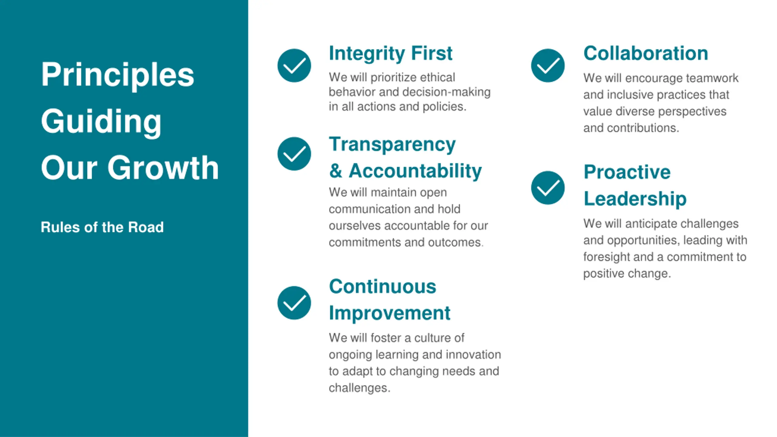 Integrity First We will prioritize ethical behavior and decision-making in all actions and policies. Collaboration Principles Guiding Our Growth We will encourage teamwork and inclusive practices that value diverse perspectives and contributions. Transparency & Accountability We will maintain open communication and hold ourselves accountable for our commitments and outcomes. Proactive Leadership We will anticipate challenges and opportunities, leading with foresight and a commitment to positive change. Rules of the Road Continuous Improvement We will foster a culture of ongoing learning and innovation to adapt to changing needs and challenges.