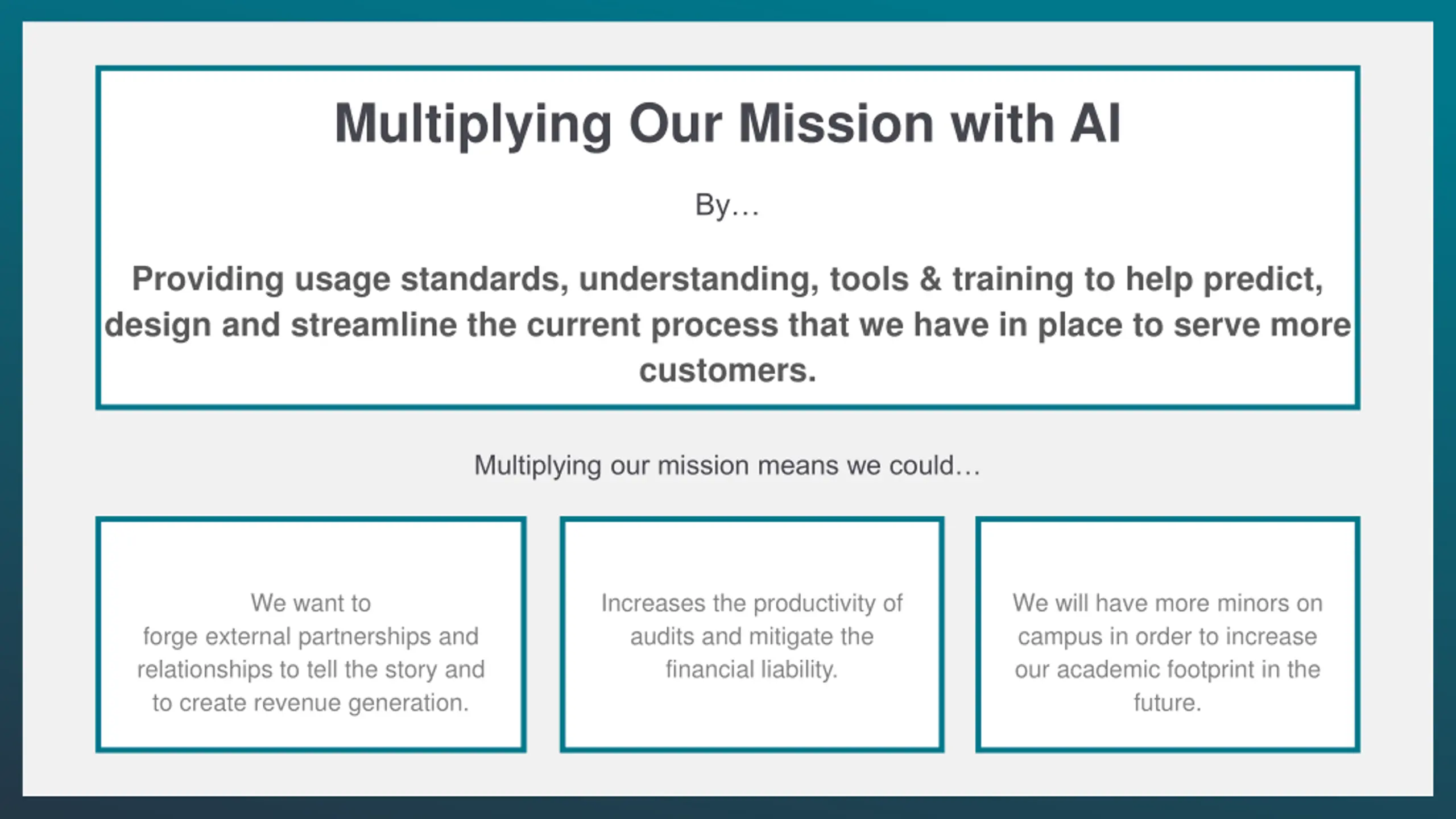 Multiplying Our Mission with AI By Providing usage standards, understanding, tools & training to help predict, design and streamline the current process that we have in place to serve more customers. Multiplying our mission means we could We want to Increases the productivity of audits and mitigate the financial liability. We will have more minors on campus in order to increase our academic footprint in the future. forge external partnerships and relationships to tell the story and to create revenue generation.