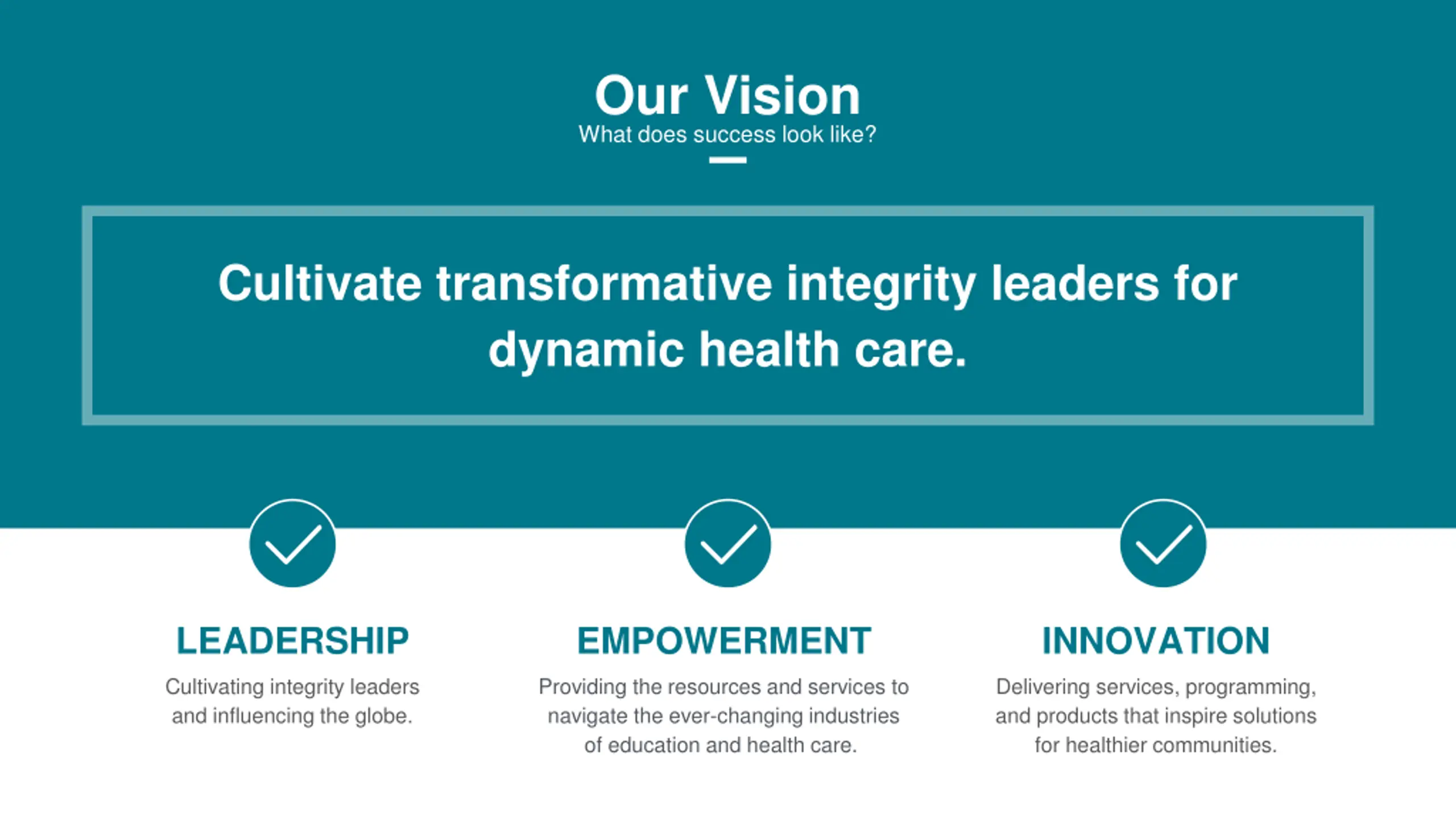 Our Vision What does success look like? Cultivate transformative integrity leaders for dynamic health care. LEADERSHIP EMPOWERMENT INNOVATION Cultivating integrity leaders and influencing the globe. Providing the resources and services to navigate the ever-changing industries of education and health care. Delivering services, programming, and products that inspire solutions for healthier communities.