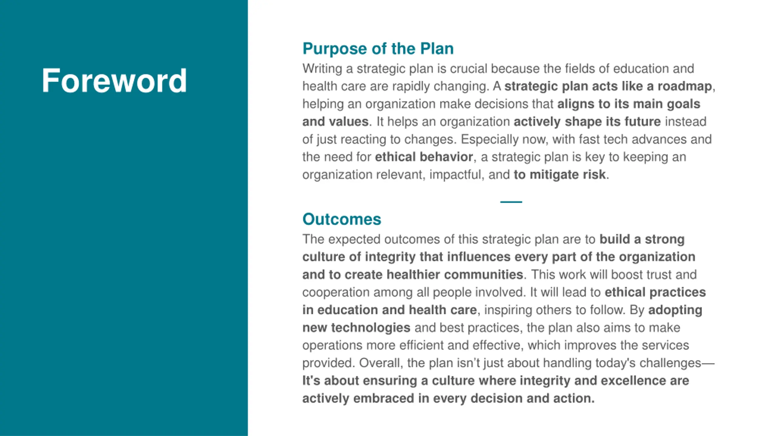 Purpose of the Plan Writing a strategic plan is crucial because the fields of education and health care are rapidly changing. A strategic plan acts like a roadmap, helping an organization make decisions that aligns to its main goals and values. It helps an organization actively shape its future instead of just reacting to changes. Especially now, with fast tech advances and the need for ethical behavior, a strategic plan is key to keeping an organization relevant, impactful, and to mitigate risk. Foreword Outcomes The expected outcomes of this strategic plan are to build a strong culture of integrity that influences every part of the organization and to create healthier communities. This work will boost trust and cooperation among all people involved. It will lead to ethical practices in education and health care, inspiring others to follow. By adopting new technologies and best practices, the plan also aims to make operations more efficient and effective, which improves the services provided. Overall, the plan isn t just about handling today's challenges It's about ensuring a culture where integrity and excellence are actively embraced in every decision and action.