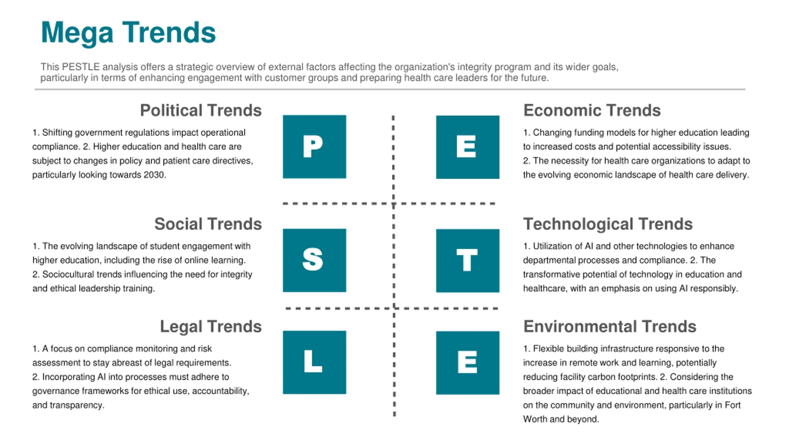 REPLACE LOGO IN MASTER Mega Trends This PESTLE analysis offers a strategic overview of external factors affecting the organization's integrity program and its wider goals, particularly in terms of enhancing engagement with customer groups and preparing health care leaders for the future. Political Trends Economic Trends P P E E 1. Shifting government regulations impact operational compliance. 2. Higher education and health care are subject to changes in policy and patient care directives, particularly looking towards 2030. 1. Changing funding models for higher education leading to increased costs and potential accessibility issues. 2. The necessity for health care organizations to adapt to the evolving economic landscape of health care delivery. Social Trends Technological Trends S S T T 1. The evolving landscape of student engagement with higher education, including the rise of online learning. 2. Sociocultural trends influencing the need for integrity and ethical leadership training. 1. Utilization of AI and other technologies to enhance departmental processes and compliance. 2. The transformative potential of technology in education and healthcare, with an emphasis on using AI responsibly. Legal Trends Environmental Trends L L E E 1. A focus on compliance monitoring and risk assessment to stay abreast of legal requirements. 2. Incorporating AI into processes must adhere to governance frameworks for ethical use, accountability, and transparency. 1. Flexible building infrastructure responsive to the increase in remote work and learning, potentially reducing facility carbon footprints. 2. Considering the broader impact of educational and health care institutions on the community and environment, particularly in Fort Worth and beyond.