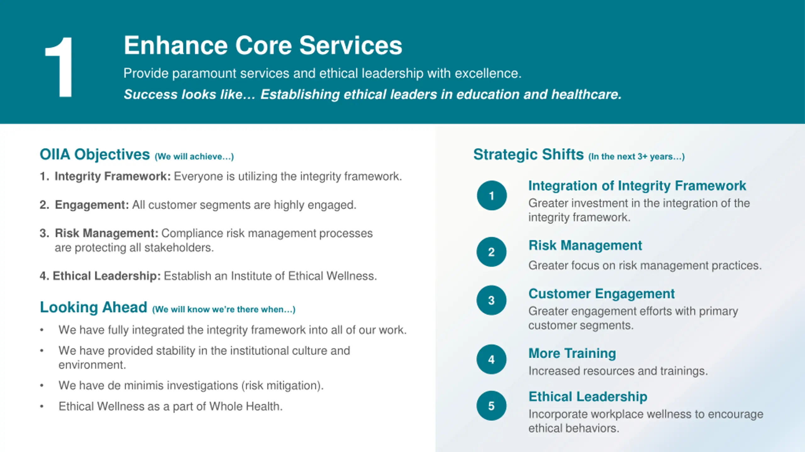 1 Enhance Core Services Provide paramount services and ethical leadership with excellence. Success looks like Establishing ethical leaders in education and healthcare. 1 are protecting all stakeholders. 2 OIIA Objectives (We will achieve ) Strategic Shifts (In the next 3+ years ) 1. Integrity Framework: Everyone is utilizing the integrity framework. Integration of Integrity Framework Greater investment in the integration of the integrity framework. _ Risk Management Greater focus on risk management practices. _ Customer Engagement Greater engagement efforts with primary customer segments. _ More Training Increased resources and trainings. _ Ethical Leadership Incorporate workplace wellness to encourage ethical behaviors. 1 2. Engagement: All customer segments are highly engaged. 3. Risk Management: Compliance risk management processes 2 4. Ethical Leadership: Establish an Institute of Ethical Wellness. 3 Looking Ahead (We will know we re there when ) We have fully integrated the integrity framework into all of our work. We have provided stability in the institutional culture and environment. 4 We have de minimis investigations (risk mitigation). 5 Ethical Wellness as a part of Whole Health.
