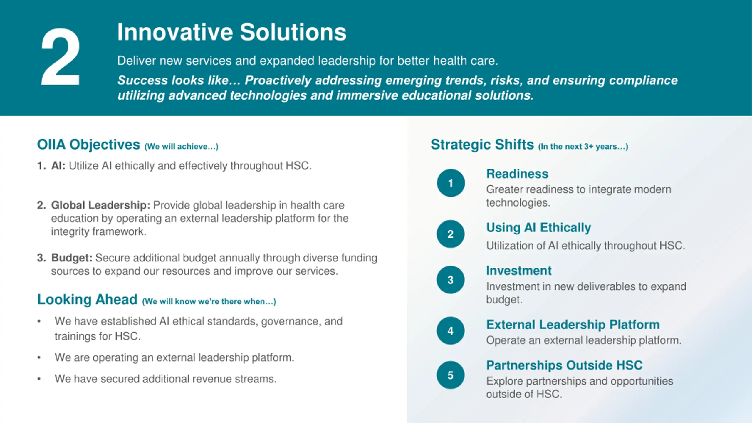 2 Innovative Solutions Deliver new services and expanded leadership for better health care. Success looks like Proactively addressing emerging trends, risks, and ensuring compliance utilizing advanced technologies and immersive educational solutions. 1 integrity framework. 2 OIIA Objectives (We will achieve ) Strategic Shifts (In the next 3+ years ) 1. AI: Utilize AI ethically and effectively throughout HSC. Readiness Greater readiness to integrate modern technologies. 1 2. Global Leadership: Provide global leadership in health care education by operating an external leadership platform for the Using AI Ethically Utilization of AI ethically throughout HSC. 2 3. Budget: Secure additional budget annually through diverse funding sources to expand our resources and improve our services. Investment Investment in new deliverables to expand budget. 3 Looking Ahead (We will know we re there when ) We have established AI ethical standards, governance, and trainings for HSC. External Leadership Platform Operate an external leadership platform. 4 We are operating an external leadership platform. Partnerships Outside HSC Explore partnerships and opportunities outside of HSC. 5 We have secured additional revenue streams.