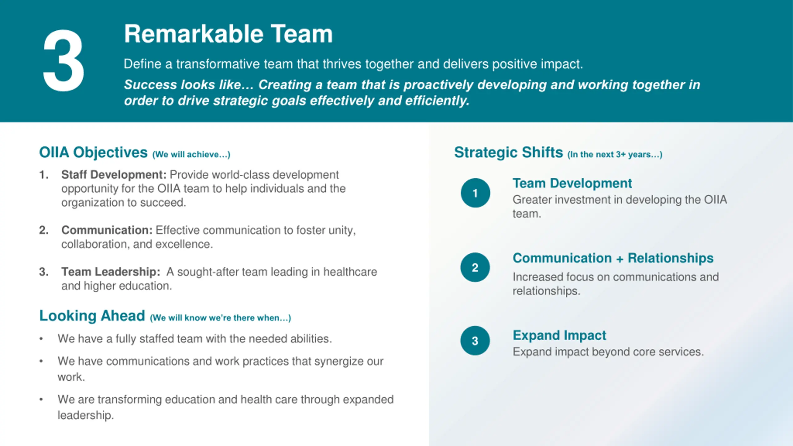 3 Remarkable Team Define a transformative team that thrives together and delivers positive impact. Success looks like Creating a team that is proactively developing and working together in order to drive strategic goals effectively and efficiently. 1 collaboration, and excellence. 2 OIIA Objectives (We will achieve ) Strategic Shifts (In the next 3+ years ) Staff Development: Provide world-class development opportunity for the OIIA team to help individuals and the organization to succeed. 1. Team Development Greater investment in developing the OIIA team. 1 Communication: Effective communication to foster unity, 2. Communication + Relationships Increased focus on communications and relationships. 2 Team Leadership: A sought-after team leading in healthcare and higher education. 3. Looking Ahead (We will know we re there when ) Expand Impact Expand impact beyond core services. We have a fully staffed team with the needed abilities. 3 We have communications and work practices that synergize our work. We are transforming education and health care through expanded leadership.