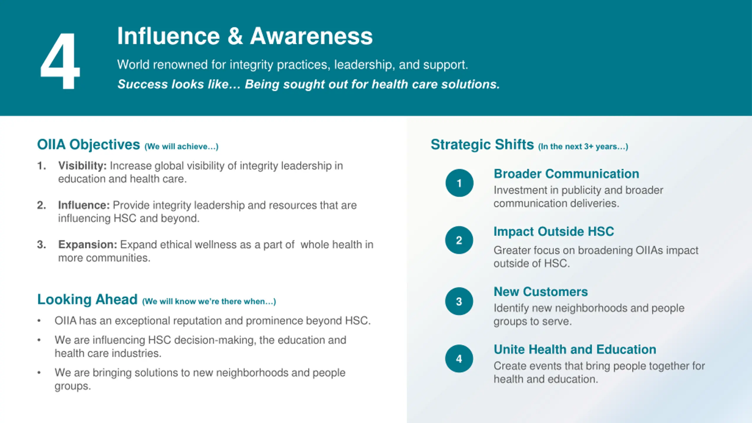 4 Influence & Awareness World renowned for integrity practices, leadership, and support. Success looks like Being sought out for health care solutions. 1 2 OIIA Objectives (We will achieve ) Strategic Shifts (In the next 3+ years ) Visibility: Increase global visibility of integrity leadership in education and health care. 1. Broader Communication Investment in publicity and broader communication deliveries. 1 Influence: Provide integrity leadership and resources that are influencing HSC and beyond. 2. Impact Outside HSC Greater focus on broadening OIIAs impact outside of HSC. 2 Expansion: Expand ethical wellness as a part of whole health in more communities. 3. New Customers Identify new neighborhoods and people groups to serve. Looking Ahead (We will know we re there when ) 3 OIIA has an exceptional reputation and prominence beyond HSC. We are influencing HSC decision-making, the education and health care industries. Unite Health and Education Create events that bring people together for health and education. 4 We are bringing solutions to new neighborhoods and people groups.