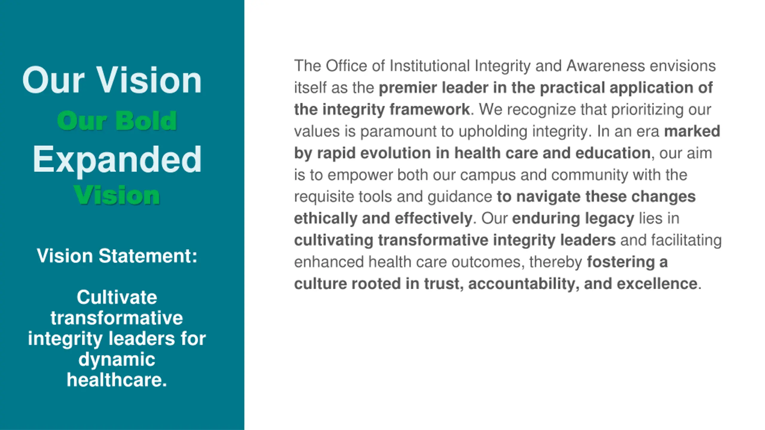 The Office of Institutional Integrity and Awareness envisions itself as the premier leader in the practical application of the integrity framework. We recognize that prioritizing our values is paramount to upholding integrity. In an era marked by rapid evolution in health care and education, our aim is to empower both our campus and community with the requisite tools and guidance to navigate these changes ethically and effectively. Our enduring legacy lies in cultivating transformative integrity leaders and facilitating enhanced health care outcomes, thereby fostering a culture rooted in trust, accountability, and excellence. Our Vision Our Bold Our Bold Expanded Vision Vision Vision Statement: Cultivate transformative integrity leaders for dynamic healthcare.