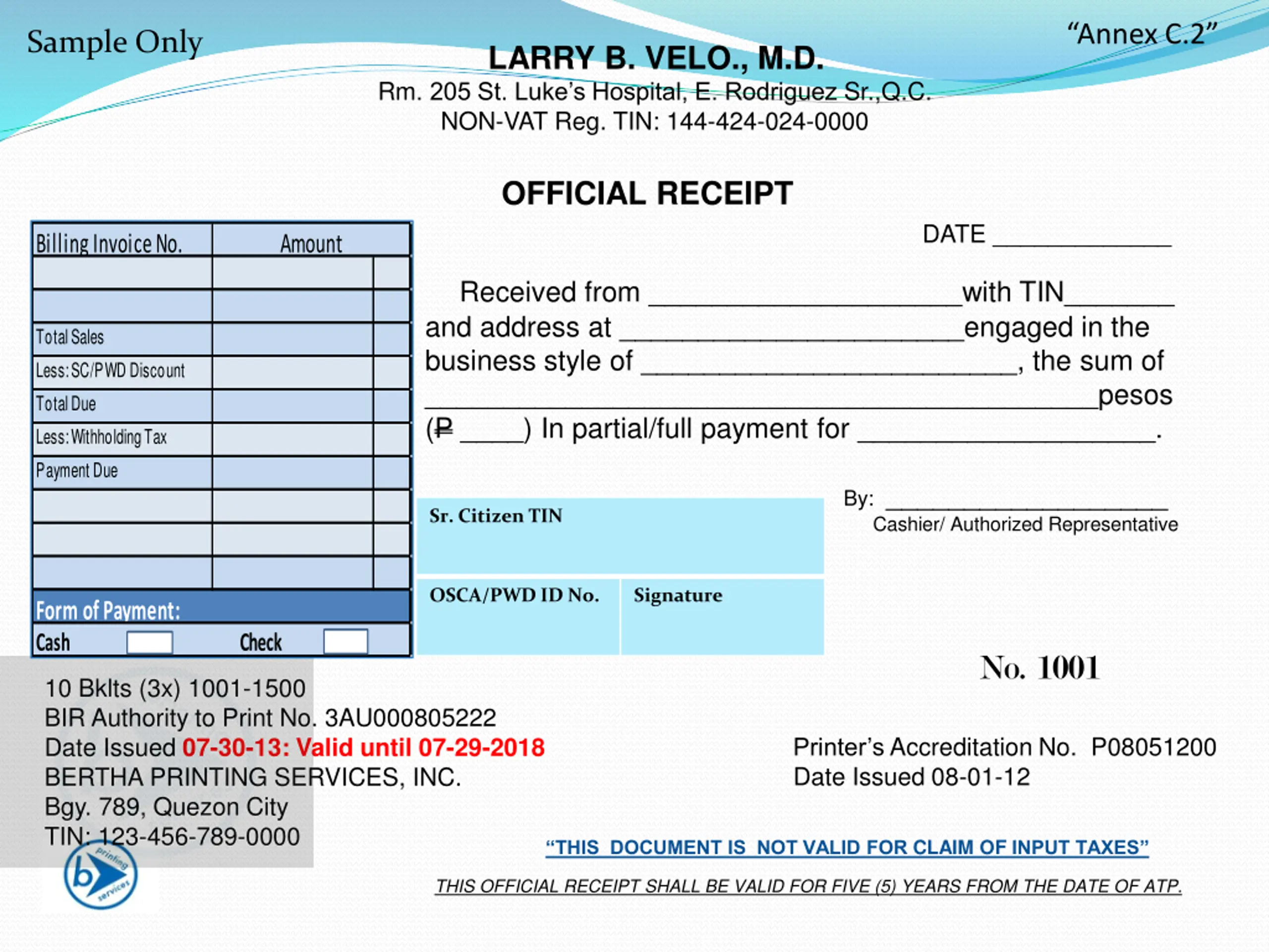Annex C.2 Sample Only LARRY B. VELO., M.D. Rm. 205 St. Luke s Hospital, E. Rodriguez Sr.,Q.C. NON-VAT Reg. TIN: 144-424-024-0000 OFFICIAL RECEIPT DATE _____________ Billing Invoice No. Amount Received from ____________________with TIN_______ and address at ______________________engaged in the business style of ________________________, the sum of ___________________________________________pesos (P ____) In partial/full payment for ___________________. Total Sales Less: SC/PWD Discount Total Due Less: Withholding Tax Payment Due By: __________________ Cashier/ Authorized Representative Sr. Citizen TIN OSCA/PWD ID No. Signature Form of Payment: Cash Check No. 1001 10 Bklts (3x) 1001-1500 BIR Authority to Print No. 3AU000805222 Date Issued 07-30-13: Valid until 07-29-2018 BERTHA PRINTING SERVICES, INC. Bgy. 789, Quezon City TIN: 123-456-789-0000 Printer s Accreditation No. P08051200 Date Issued 08-01-12 THIS DOCUMENT IS NOT VALID FOR CLAIM OF INPUT TAXES THIS OFFICIAL RECEIPT SHALL BE VALID FOR FIVE (5) YEARS FROM THE DATE OF ATP.