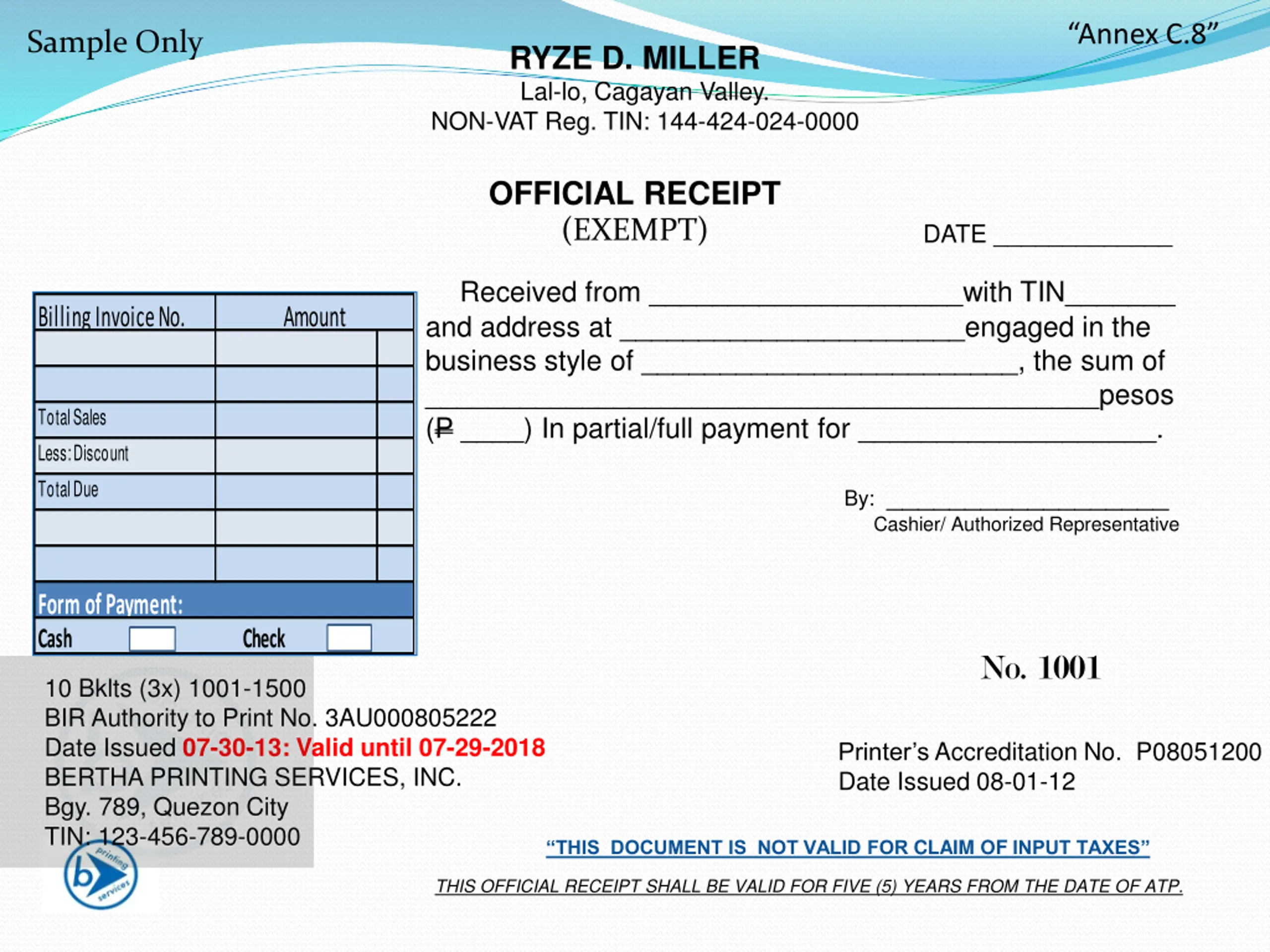 Annex C.8 Sample Only RYZE D. MILLER Lal-lo, Cagayan Valley. NON-VAT Reg. TIN: 144-424-024-0000 OFFICIAL RECEIPT (EXEMPT) DATE _____________ Received from ____________________with TIN_______ and address at ______________________engaged in the business style of ________________________, the sum of ___________________________________________pesos (P ____) In partial/full payment for ___________________. Billing Invoice No. Amount Total Sales Less: Discount Total Due By: __________________ Cashier/ Authorized Representative Form of Payment: Cash Check No. 1001 10 Bklts (3x) 1001-1500 BIR Authority to Print No. 3AU000805222 Date Issued 07-30-13: Valid until 07-29-2018 BERTHA PRINTING SERVICES, INC. Bgy. 789, Quezon City TIN: 123-456-789-0000 Printer s Accreditation No. P08051200 Date Issued 08-01-12 THIS DOCUMENT IS NOT VALID FOR CLAIM OF INPUT TAXES THIS OFFICIAL RECEIPT SHALL BE VALID FOR FIVE (5) YEARS FROM THE DATE OF ATP.