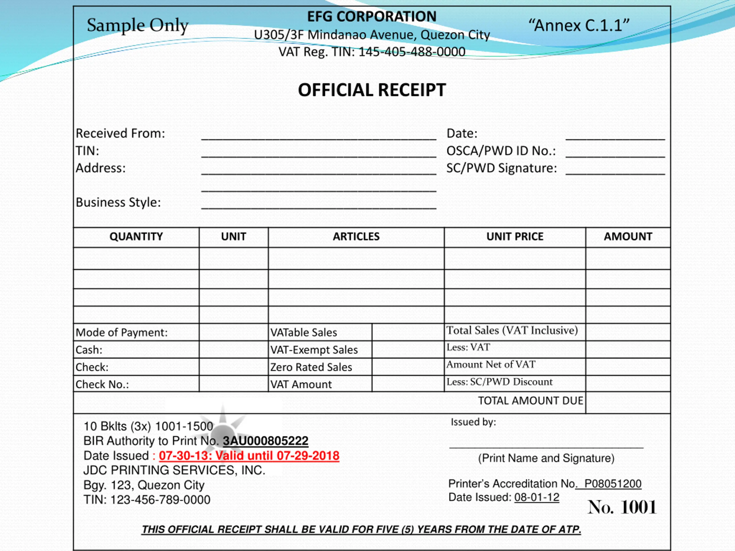 EFG CORPORATION U305/3F Mindanao Avenue, Quezon City VAT Reg. TIN: 145-405-488-0000 Sample Only Annex C.1.1 OFFICIAL RECEIPT Received From: TIN: Address: _________________________________ Date: _________________________________ _________________________________ _________________________________ _________________________________ ______________ ______________ ______________ OSCA/PWD ID No.: SC/PWD Signature: Business Style: QUANTITY UNIT ARTICLES UNIT PRICE AMOUNT Total Sales (VAT Inclusive) Mode of Payment: Cash: Check: Check No.: VATable Sales VAT-Exempt Sales Zero Rated Sales VAT Amount Less: VAT Amount Net of VAT Less: SC/PWD Discount TOTAL AMOUNT DUE Issued by: 10 Bklts (3x) 1001-1500 BIR Authority to Print No. 3AU000805222 Date Issued : 07-30-13: Valid until 07-29-2018 JDC PRINTING SERVICES, INC. Bgy. 123, Quezon City TIN: 123-456-789-0000 _______________________________ (Print Name and Signature) Printer s Accreditation No. P08051200 Date Issued: 08-01-12 No. 1001 THIS OFFICIAL RECEIPT SHALL BE VALID FOR FIVE (5) YEARS FROM THE DATE OF ATP.