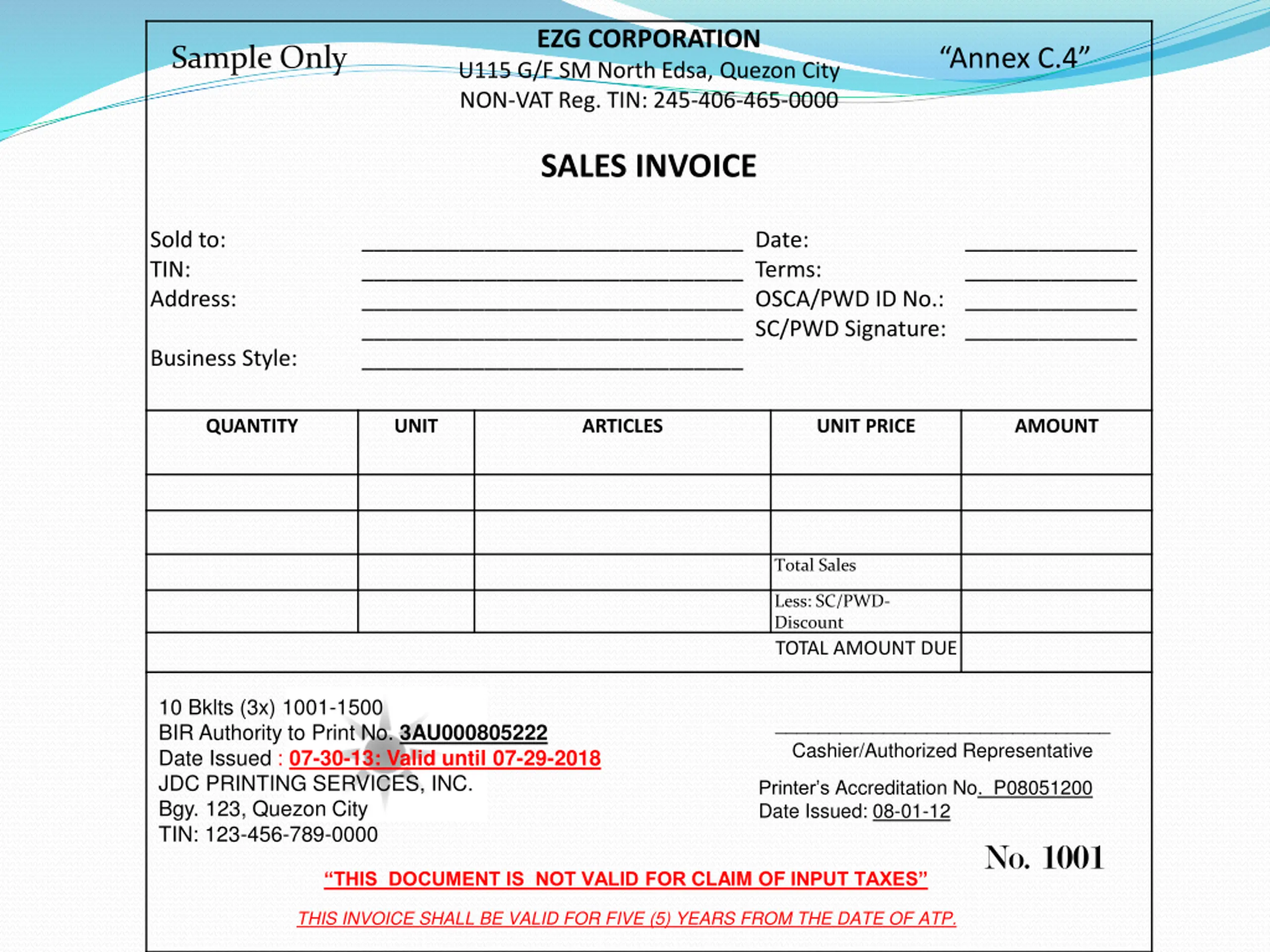 EZG CORPORATION U115 G/F SM North Edsa, Quezon City NON-VAT Reg. TIN: 245-406-465-0000 Sample Only Annex C.4 SALES INVOICE Sold to: TIN: Address: _______________________________ Date: _______________________________ _______________________________ _______________________________ _______________________________ ______________ ______________ ______________ ______________ Terms: OSCA/PWD ID No.: SC/PWD Signature: Business Style: QUANTITY UNIT ARTICLES UNIT PRICE AMOUNT Total Sales Less: SC/PWD- Discount TOTAL AMOUNT DUE 10 Bklts (3x) 1001-1500 BIR Authority to Print No. 3AU000805222 Date Issued : 07-30-13: Valid until 07-29-2018 JDC PRINTING SERVICES, INC. Bgy. 123, Quezon City TIN: 123-456-789-0000 _______________________________ Cashier/Authorized Representative Printer s Accreditation No. P08051200 Date Issued: 08-01-12 No. 1001 THIS DOCUMENT IS NOT VALID FOR CLAIM OF INPUT TAXES THIS INVOICE SHALL BE VALID FOR FIVE (5) YEARS FROM THE DATE OF ATP.
