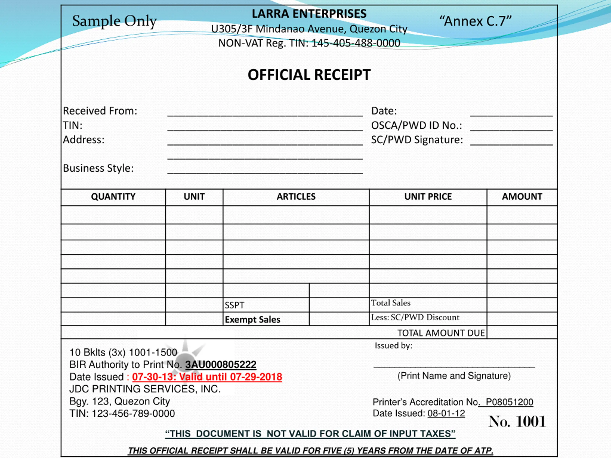 LARRA ENTERPRISES U305/3F Mindanao Avenue, Quezon City NON-VAT Reg. TIN: 145-405-488-0000 Sample Only Annex C.7 OFFICIAL RECEIPT Received From: TIN: Address: _________________________________ Date: _________________________________ _________________________________ _________________________________ _________________________________ ______________ ______________ ______________ OSCA/PWD ID No.: SC/PWD Signature: Business Style: QUANTITY UNIT ARTICLES UNIT PRICE AMOUNT Total Sales SSPT Exempt Sales Less: SC/PWD Discount TOTAL AMOUNT DUE Issued by: 10 Bklts (3x) 1001-1500 BIR Authority to Print No. 3AU000805222 Date Issued : 07-30-13: Valid until 07-29-2018 JDC PRINTING SERVICES, INC. Bgy. 123, Quezon City TIN: 123-456-789-0000 _______________________________ (Print Name and Signature) Printer s Accreditation No. P08051200 Date Issued: 08-01-12 No. 1001 THIS DOCUMENT IS NOT VALID FOR CLAIM OF INPUT TAXES THIS OFFICIAL RECEIPT SHALL BE VALID FOR FIVE (5) YEARS FROM THE DATE OF ATP.