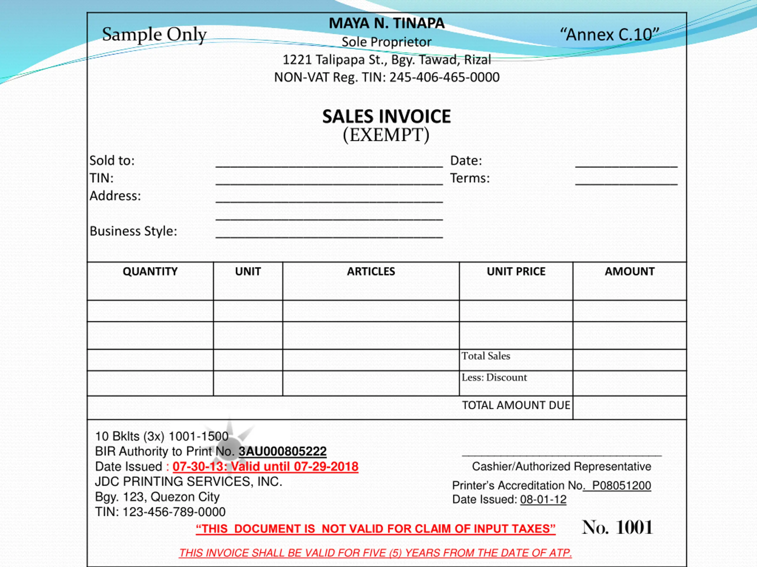 MAYA N. TINAPA Sole Proprietor 1221 Talipapa St., Bgy. Tawad, Rizal NON-VAT Reg. TIN: 245-406-465-0000 Sample Only Annex C.10 SALES INVOICE (EXEMPT) Sold to: TIN: Address: _______________________________ Date: _______________________________ _______________________________ _______________________________ _______________________________ ______________ ______________ Terms: Business Style: QUANTITY UNIT ARTICLES UNIT PRICE AMOUNT Total Sales Less: Discount TOTAL AMOUNT DUE 10 Bklts (3x) 1001-1500 BIR Authority to Print No. 3AU000805222 Date Issued : 07-30-13: Valid until 07-29-2018 JDC PRINTING SERVICES, INC. Bgy. 123, Quezon City TIN: 123-456-789-0000 _______________________________ Cashier/Authorized Representative Printer s Accreditation No. P08051200 Date Issued: 08-01-12 No. 1001 THIS DOCUMENT IS NOT VALID FOR CLAIM OF INPUT TAXES THIS INVOICE SHALL BE VALID FOR FIVE (5) YEARS FROM THE DATE OF ATP.